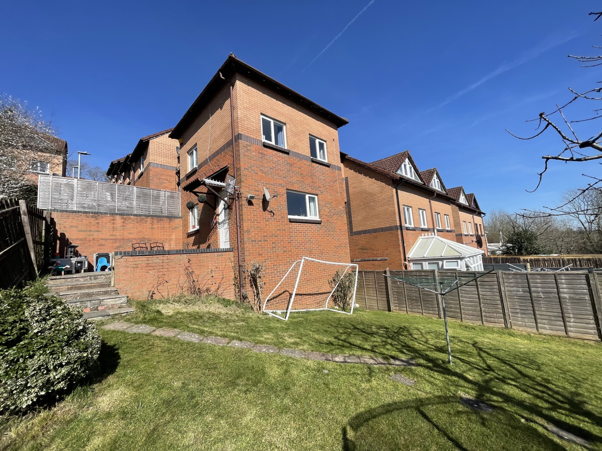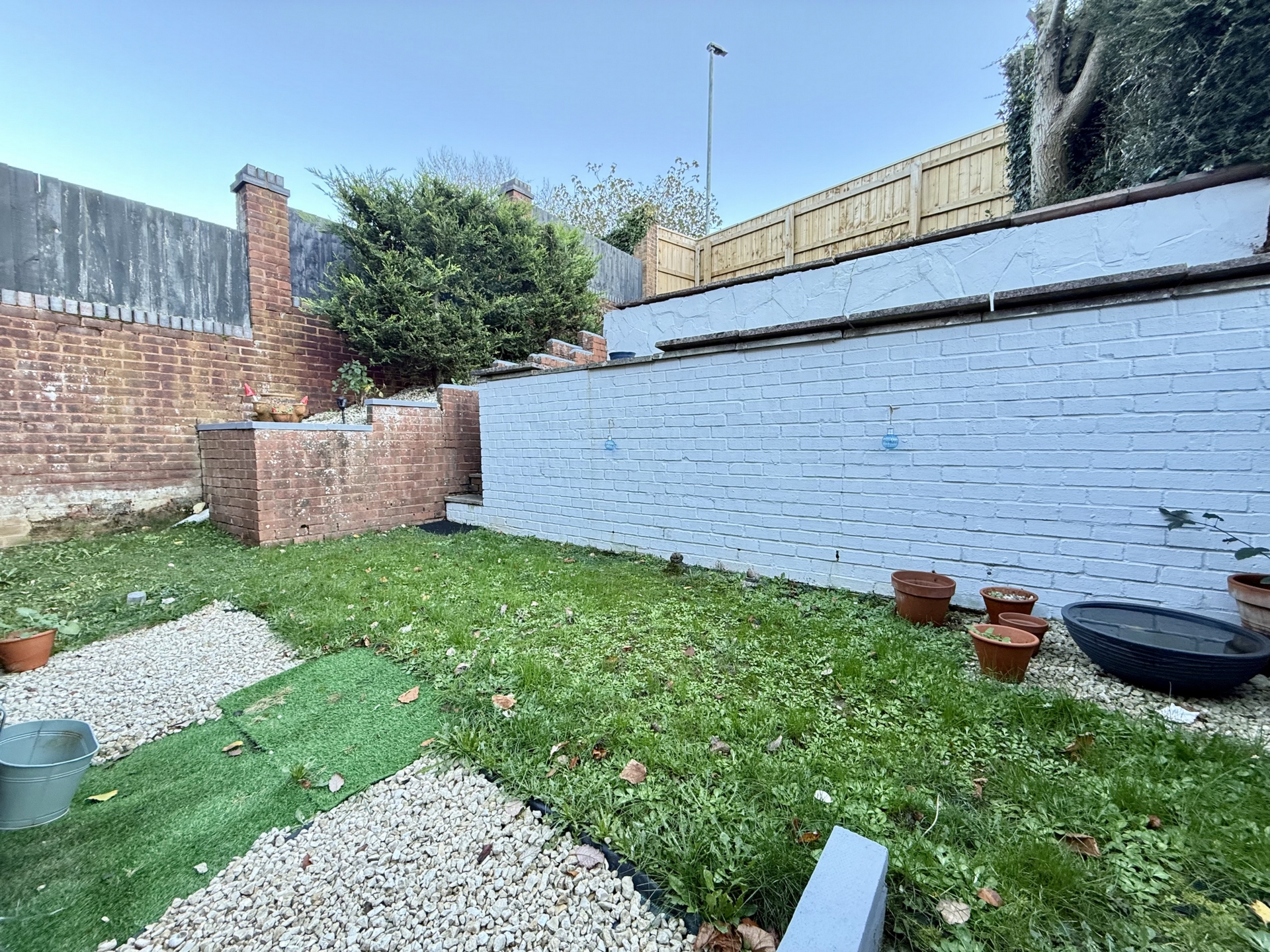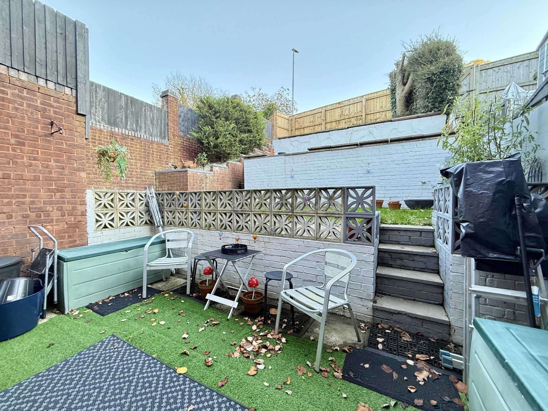 OUTSIDE: To the front of the property steps lead to the front door with section of mature shrub and side gate providing rear access. The rear garden is tiered section of artificial grass and steps leading to a grass lawn and paved patio.