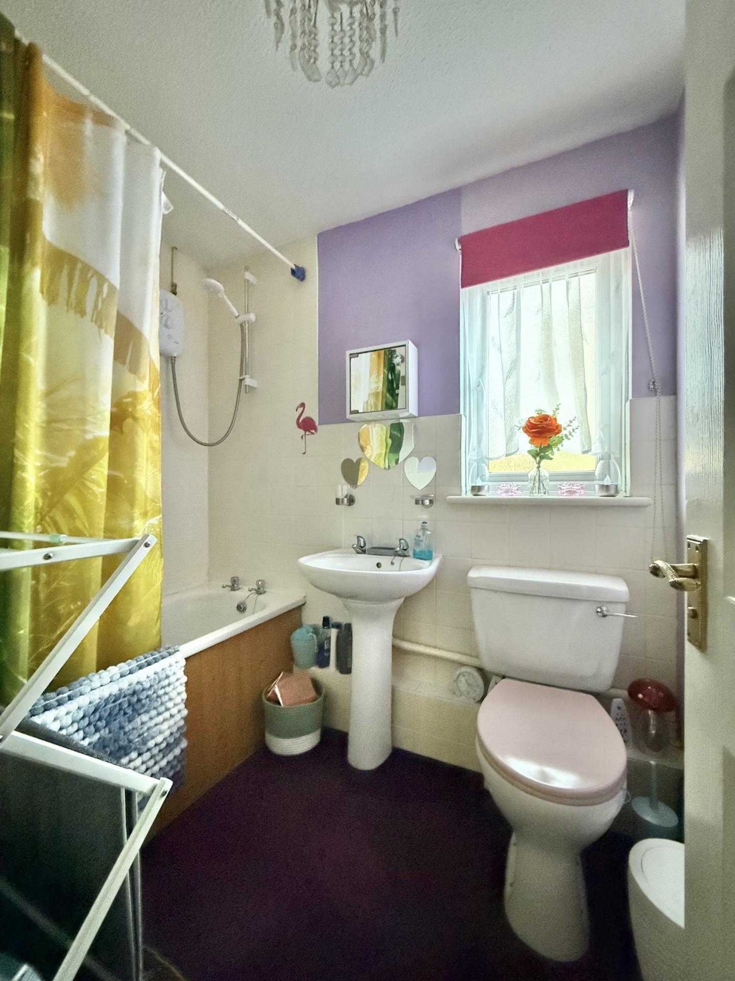 BATHROOM: Close coupled WC, pedestal wash hand basin, panelled bath with wall mounted shower over, double glazed window to the side.