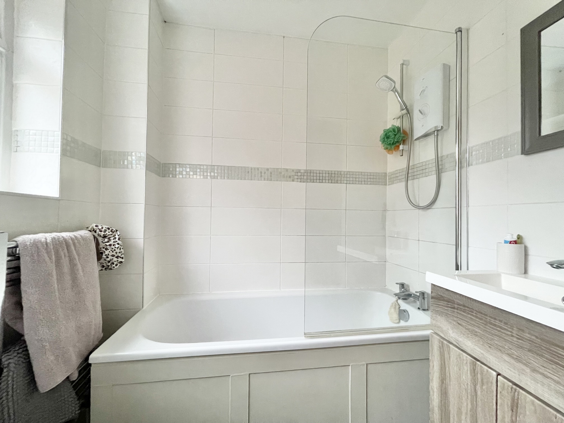 BATHROOM: Close coupled WC, wash hand basin, panelled bath with electric shower, heated towel rail, obscure double glazed window to the rear.