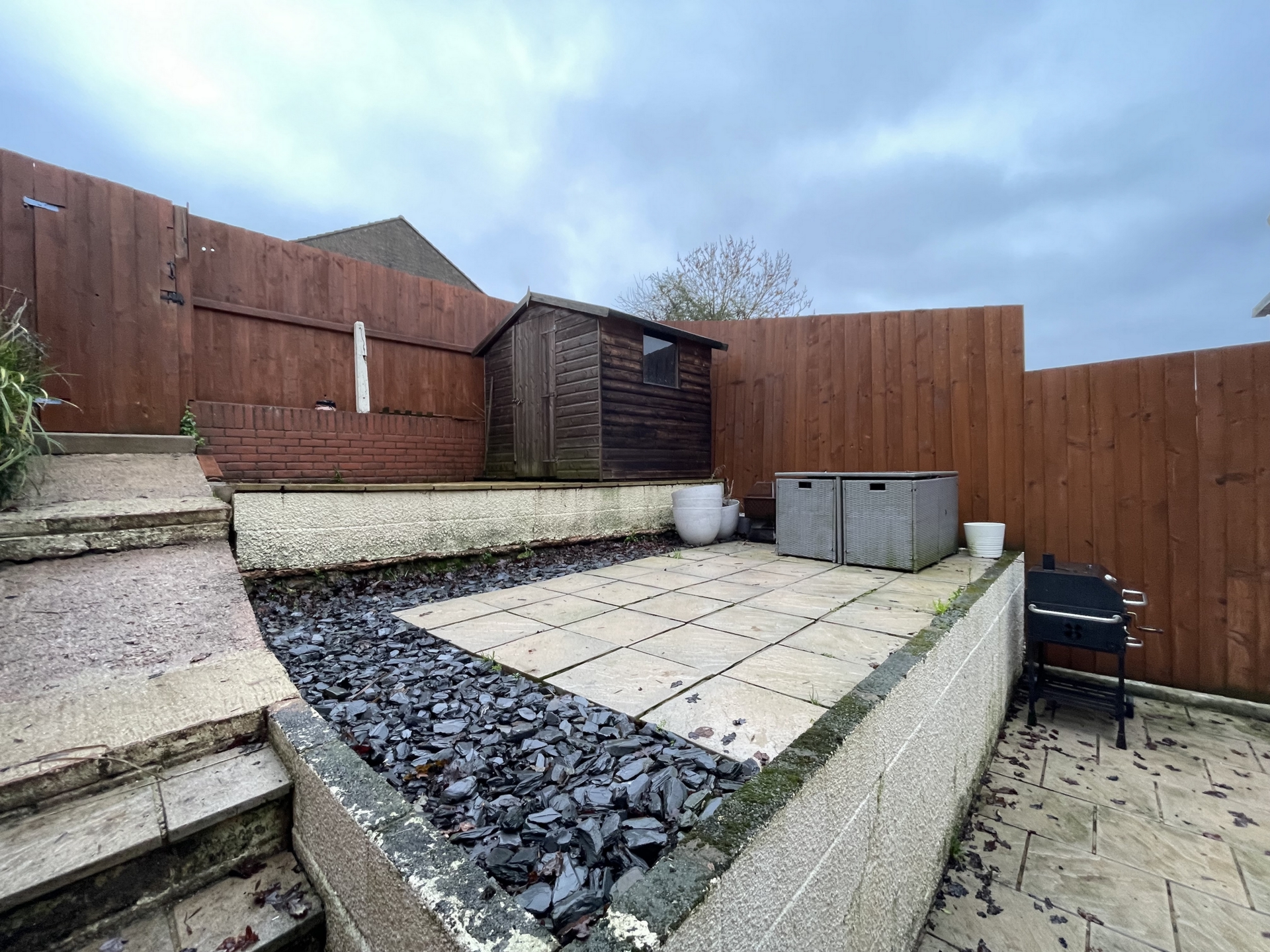 OUTSIDE: To the front of the property steps lead up to the front door bordered by grass lawn. To the rear is a tiered garden laid to paved patio and decorative chippings for easy maintenance with handy timber storage shed and gate providing access.