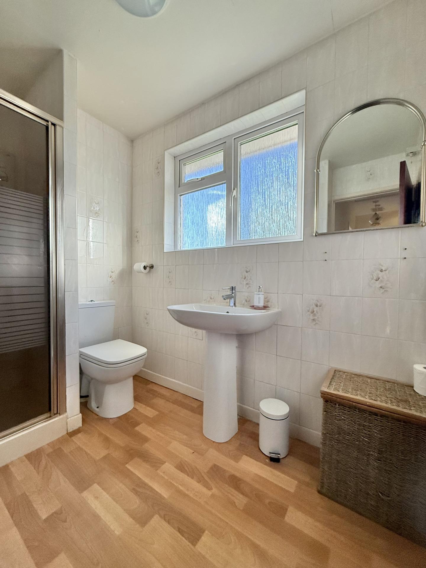 SHOWER ROOM: Shower cubicle, close coupled WC, pedestal wash hand basin, radiator, double glazed window to the rear.