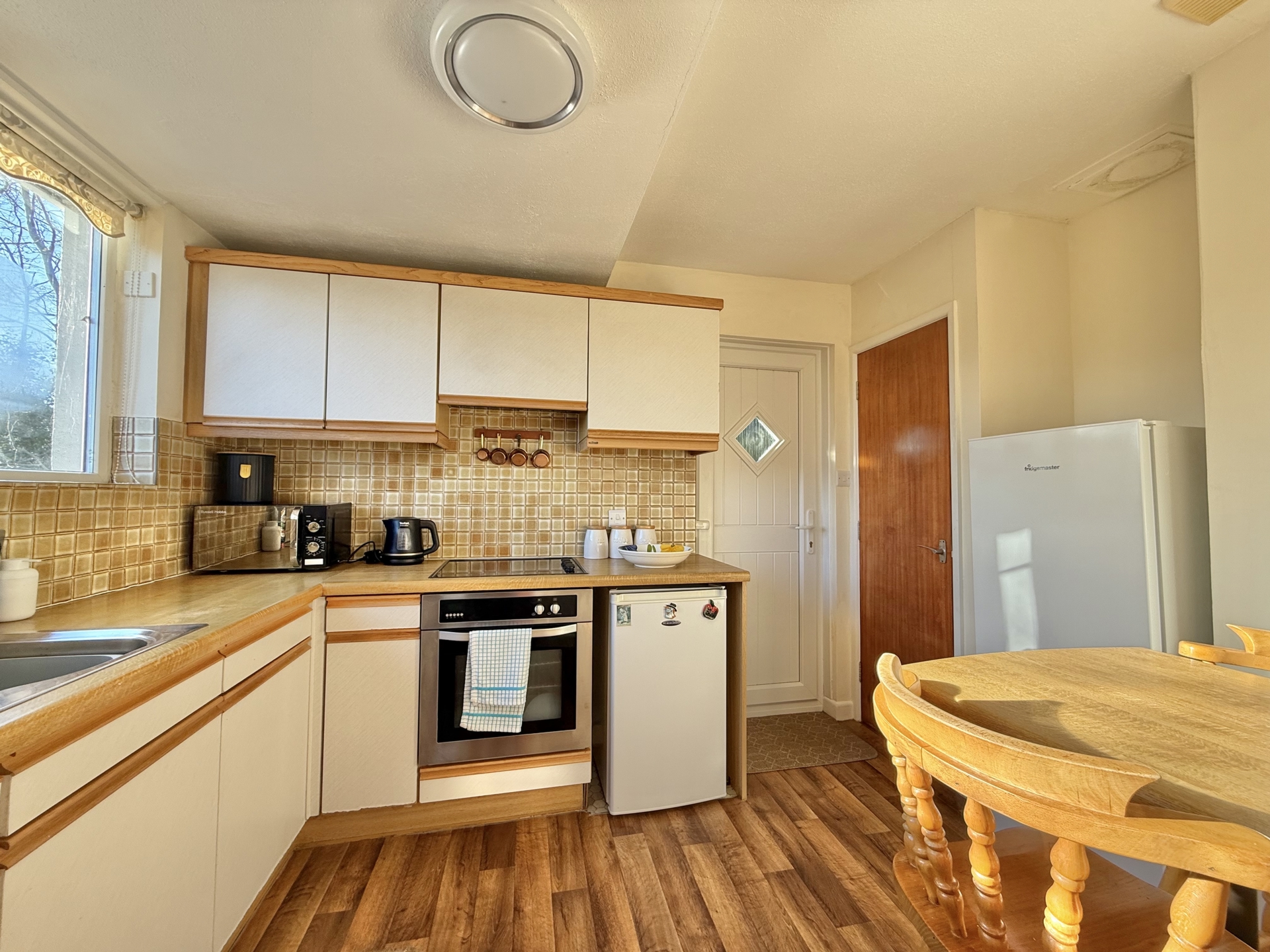 KITCHEN/BREAKFAST ROOM: 3.0m x 2.7m (9'10" x 8'10") Plus alcove, Base cupboards and drawers with worktop over, sink and drainer, built in oven and hob, space for fridge, space for washing machine, wall mounted cupboards, cupboard housing boiler, double glazed window, door to the garden.