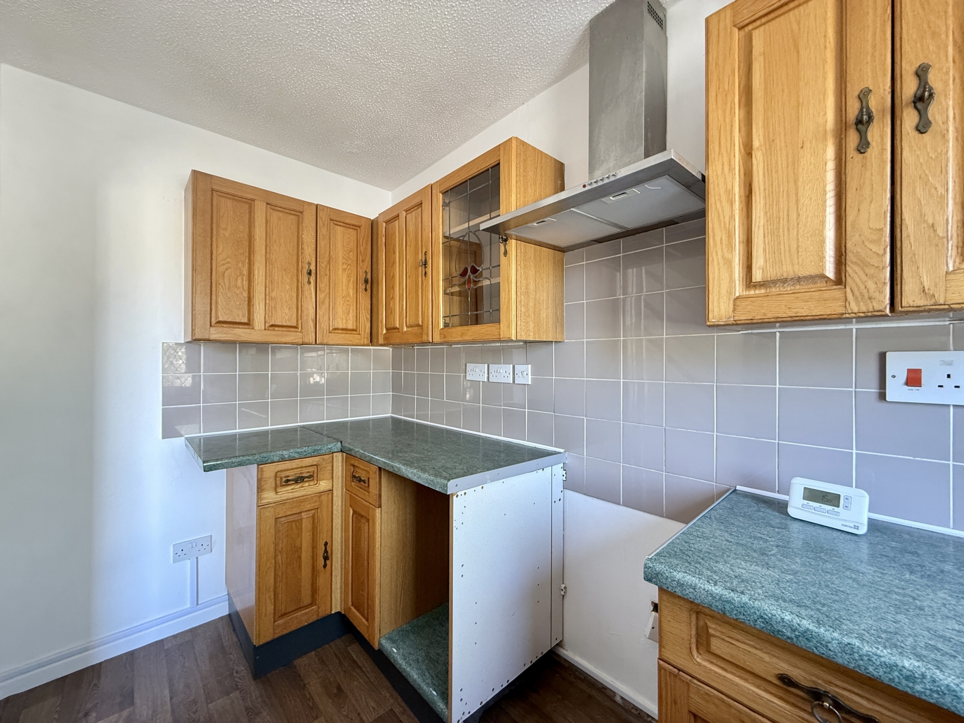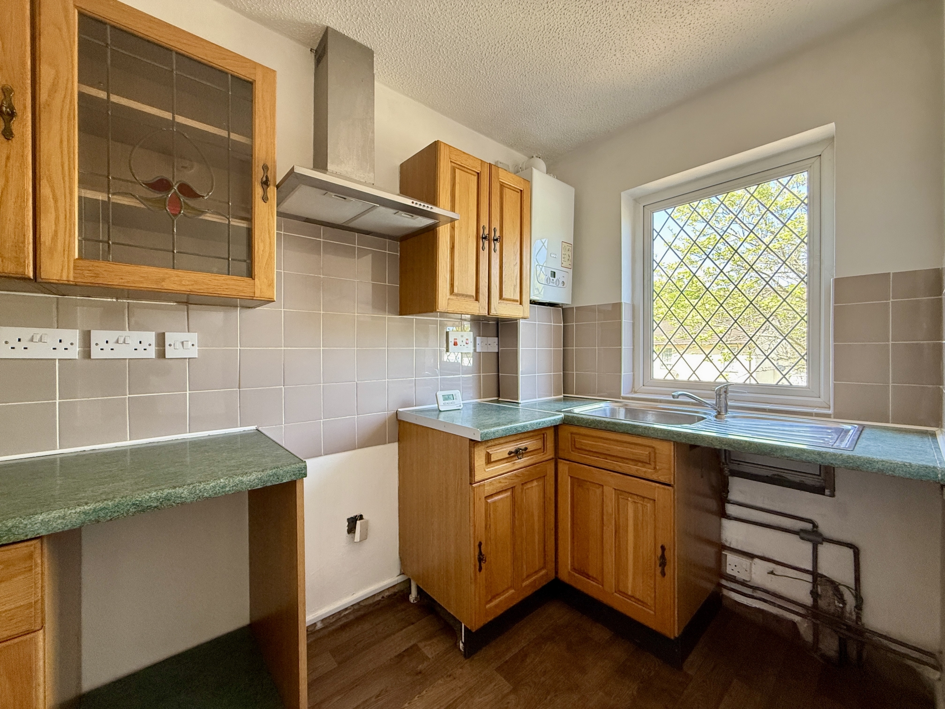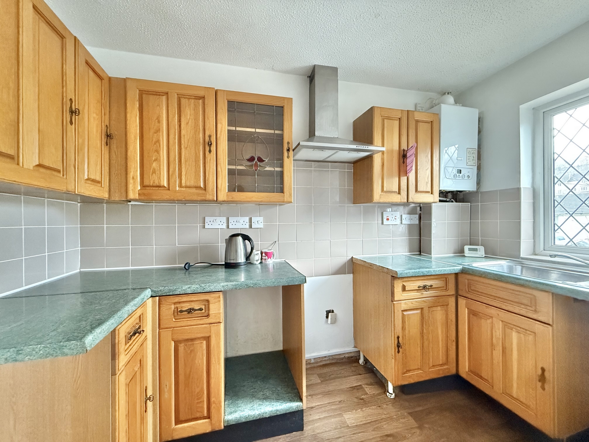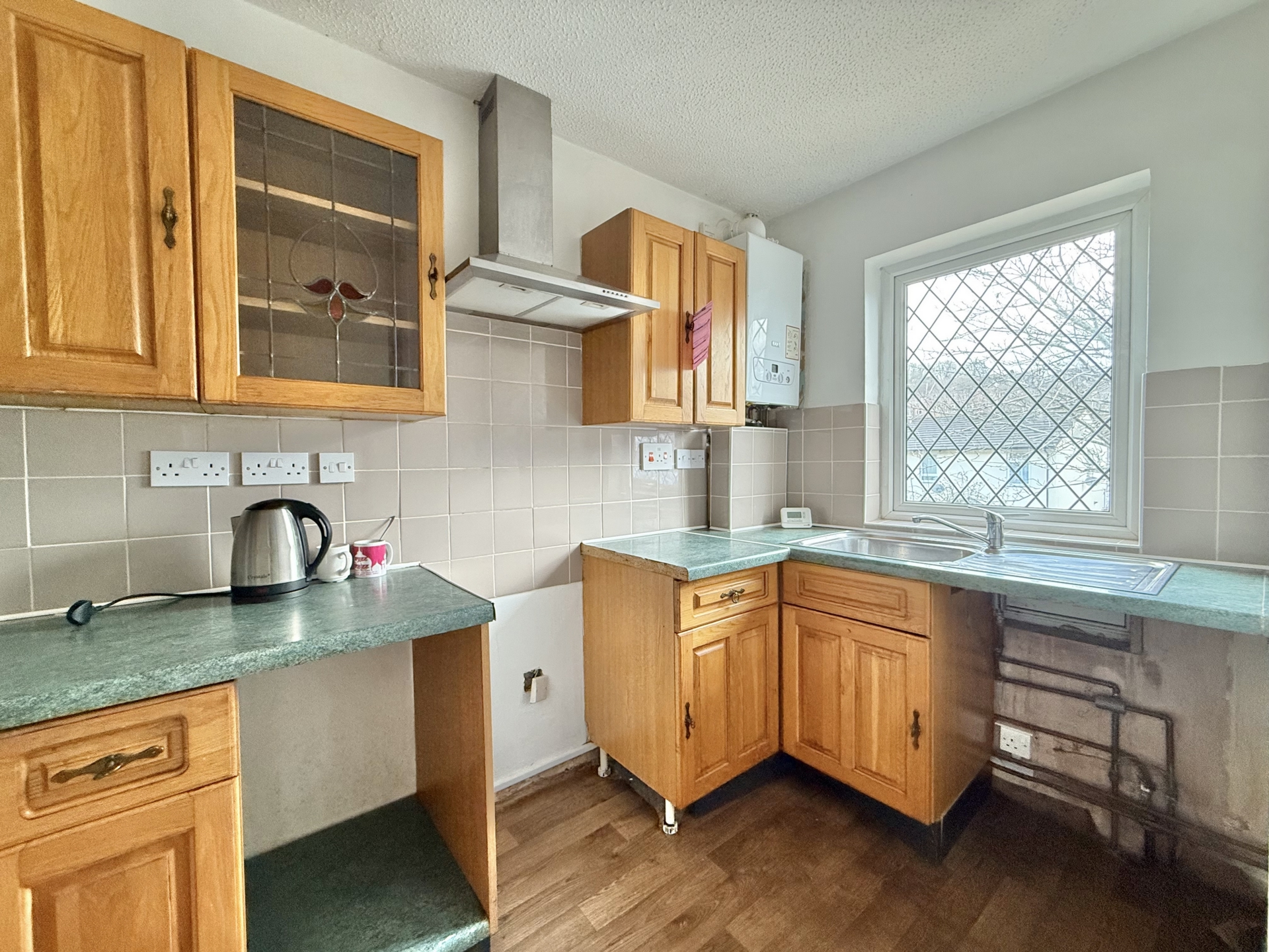 KITCHEN: 3.1m x 1.7m (10'2" x 5'7"), Base cupboards and drawers with worktop over, sink and drainer, wall mounted cupboards, wall mounted boiler, space for cooker with hood over, additional appliance space, double glazed window to the front.