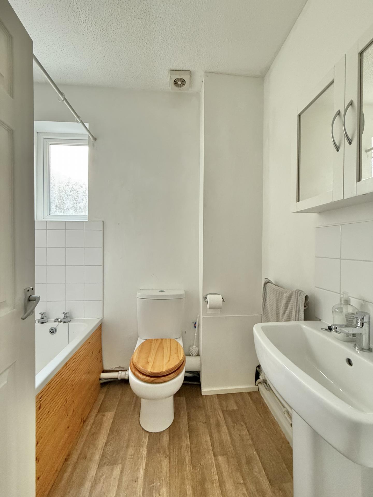 BATHROOM: Pedestal wash hand basin, close coupled WC, panelled bath with shower over, double glazed window.