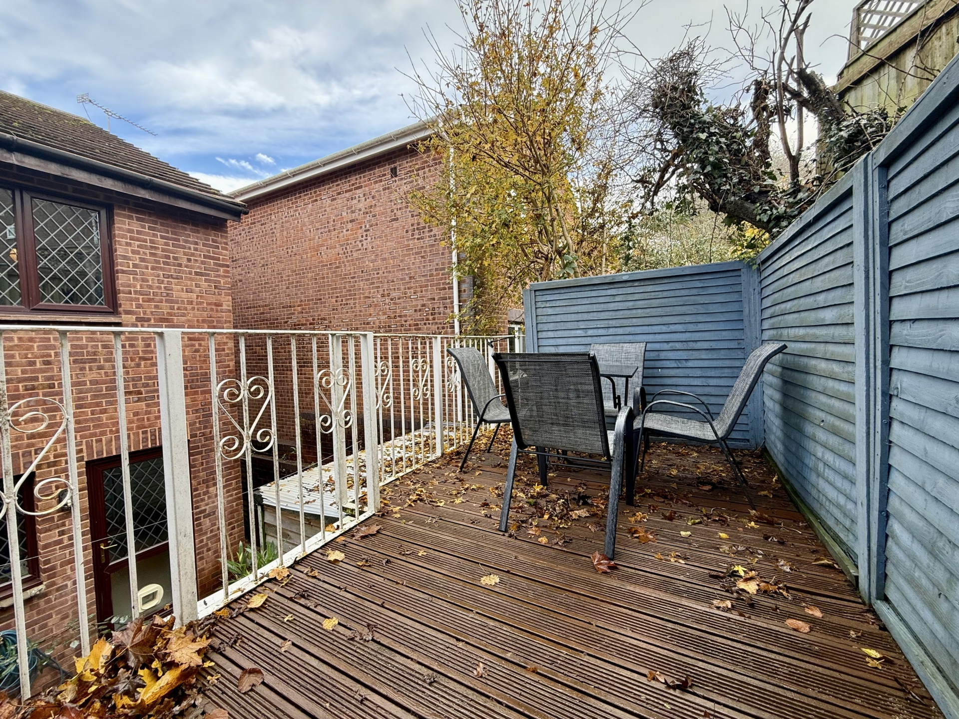 OUTSIDE: To the rear is an enclosed garden with paved patio and steps leading up to a decked area with handy storage shed and gate providing rear access.