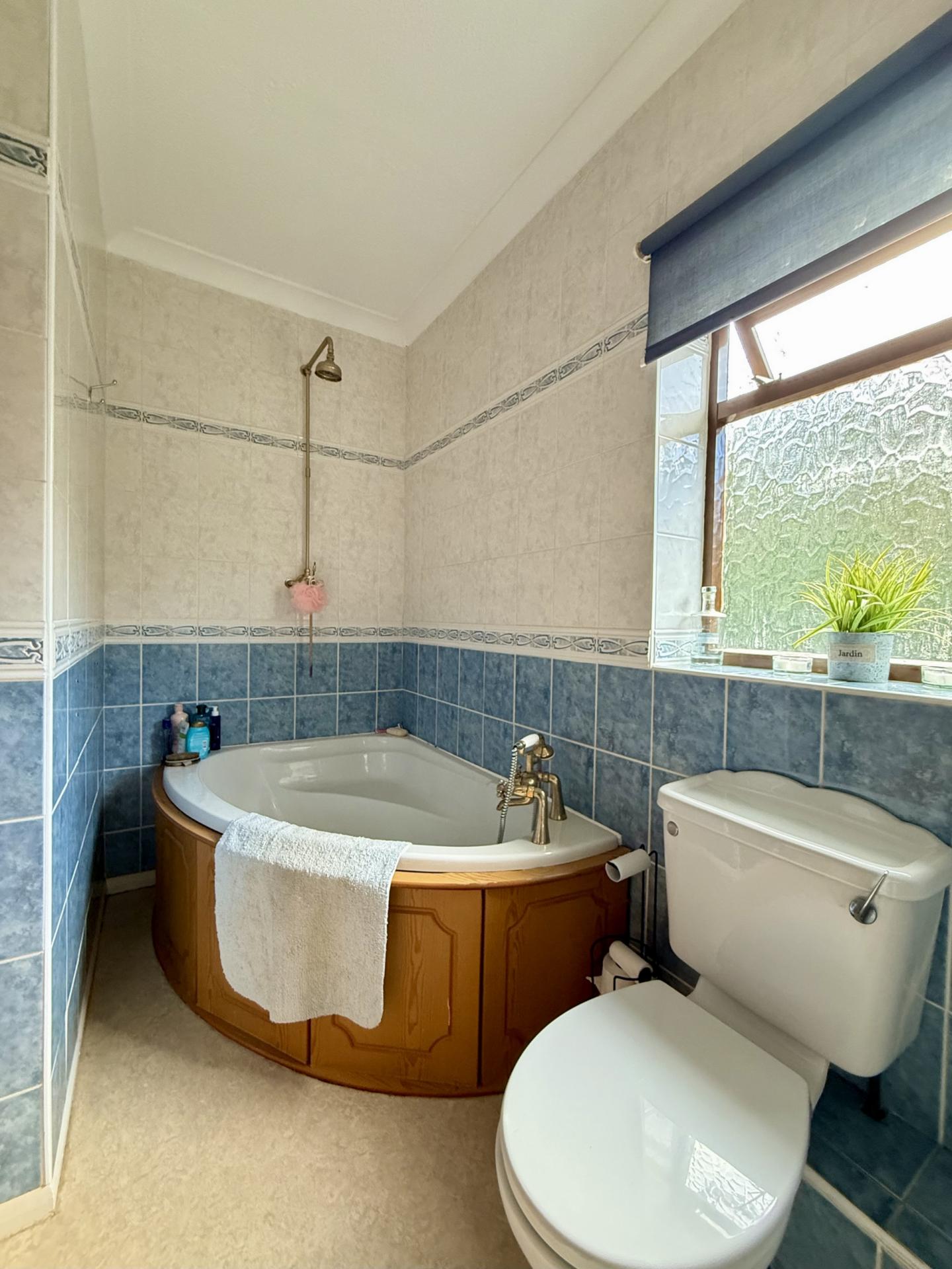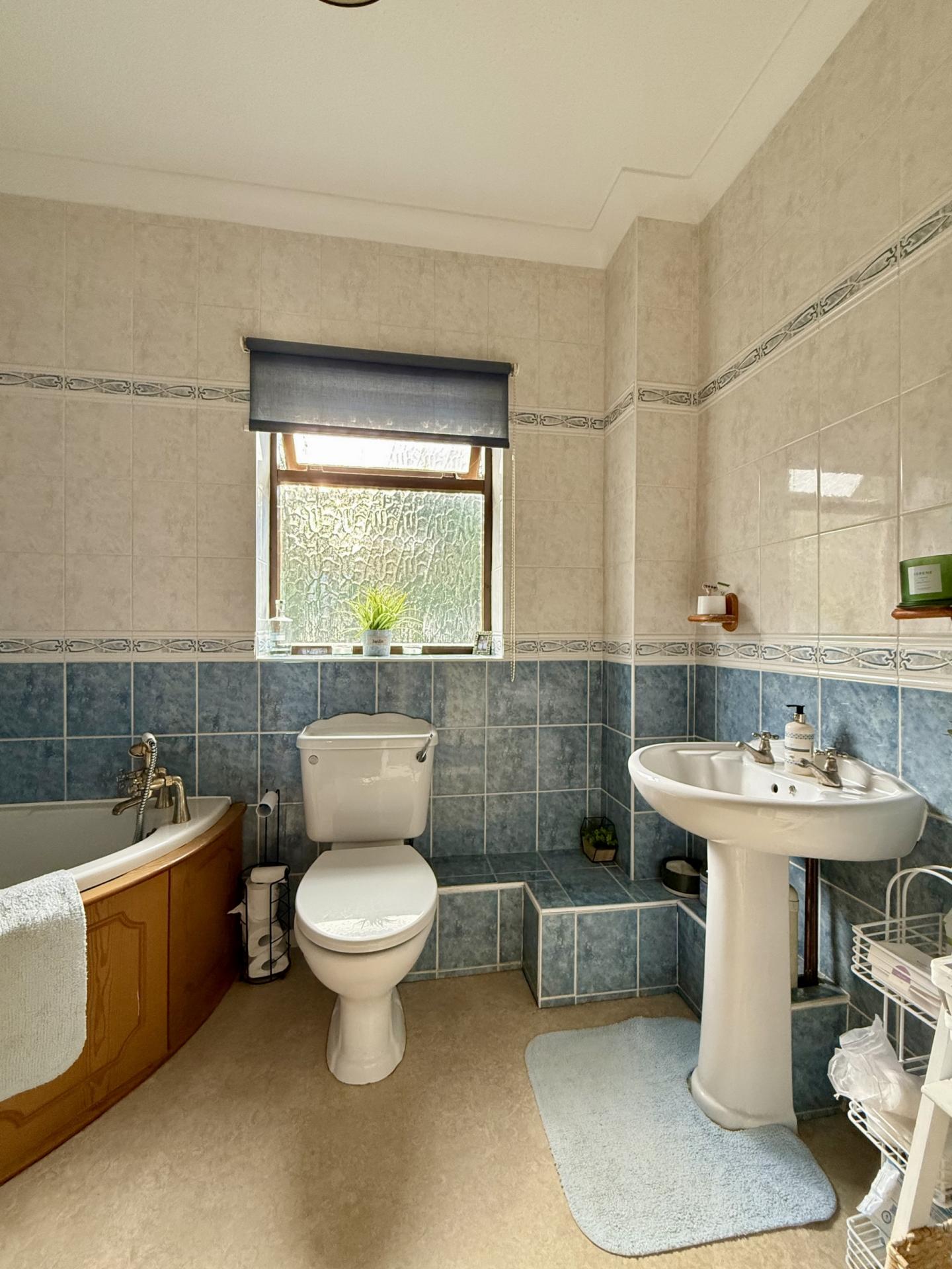 BATHROOM: Pedestal wash hand basin, close coupled WC, corner panelled bath with shower over, window to the rear.