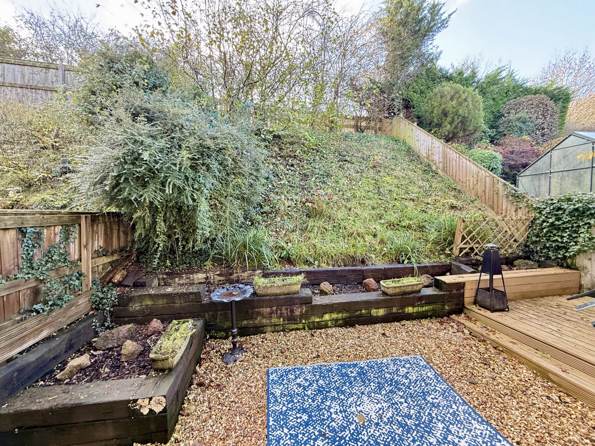 OUTSIDE: To the front of the property is an area designed for off road parking which leads to the garage with section of stone chippings. The rear garden is laid toto a decked patio, stone chippings and section with shrubs and trees.