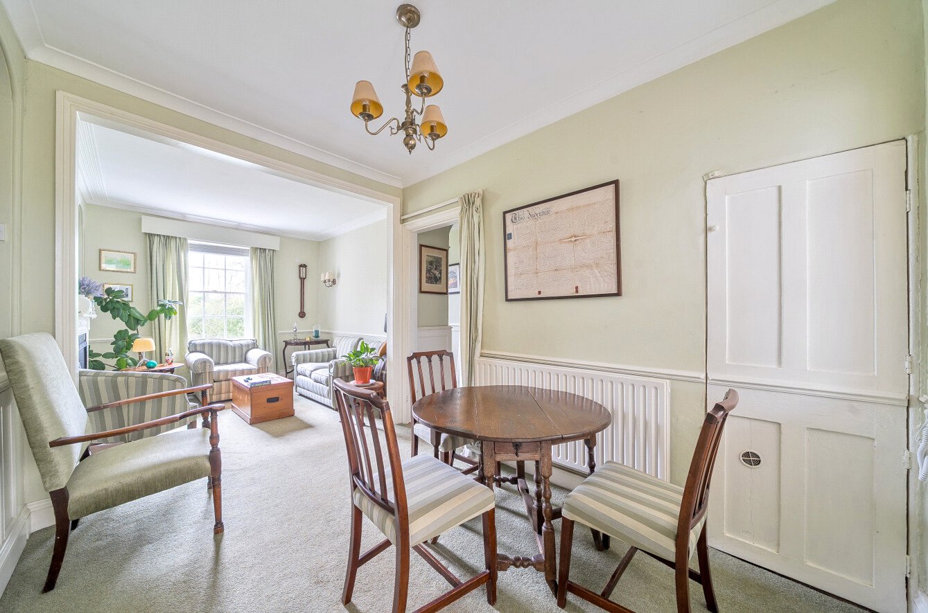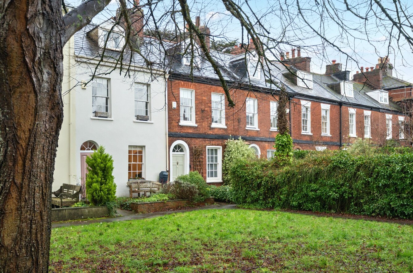 Outside, the property is approached via a paved path through a front garden with mature planting, set beside the attractive communal green. To the rear, a private and enclosed courtyard garden provides a sheltered retreat, paved with established borders of shrubs and plants.