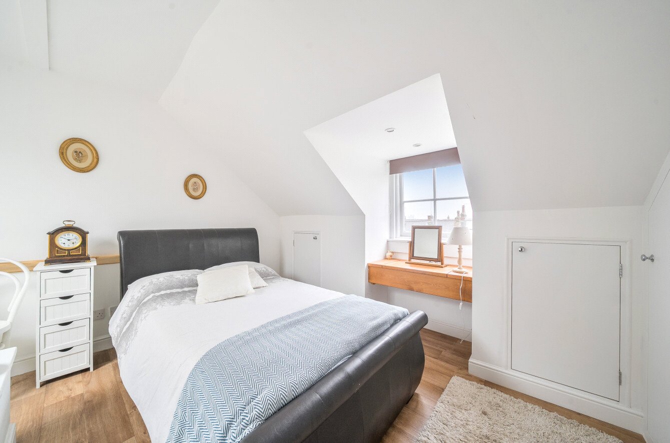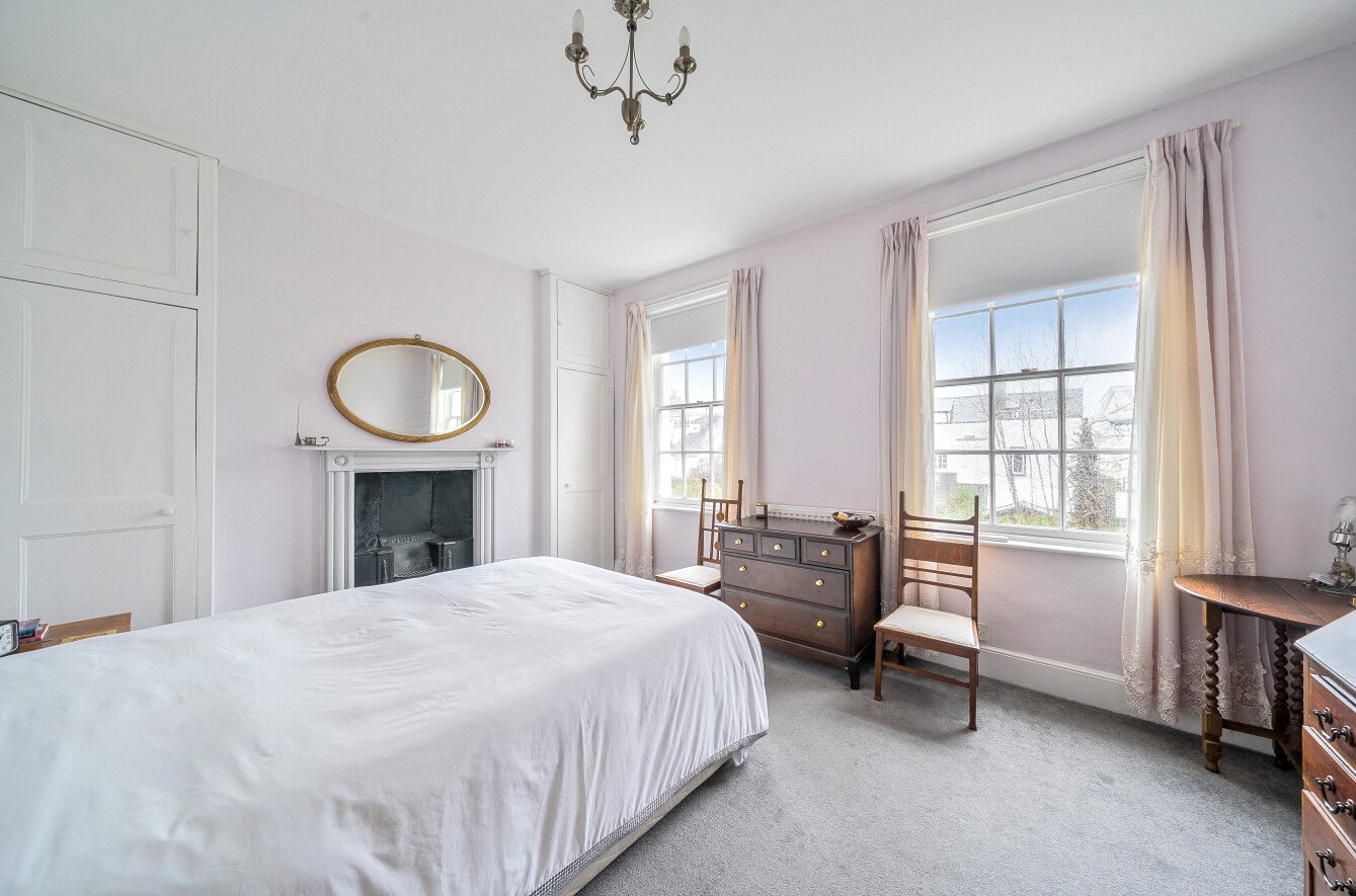 The staircase continues to the second floor, where a further double bedroom enjoys dual-aspect windows, an extensive range of fitted cupboards, and an open-plan en suite bathroom with period-style roll-top bath on claw feet, pedestal wash basin, WC, and heated towel rail.