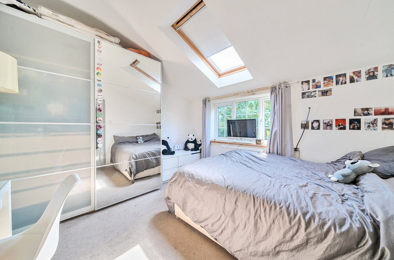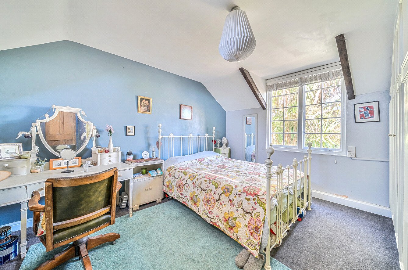 Upstairs, the accommodation continues to impress with three well-proportioned bedrooms. The principal bedroom enjoys dual-aspect views, fitted wardrobes, and a charming exposed brick chimney breast. The second bedroom enjoys a pleasant outlook over the garden and offers ample storage and exposed ceiling beams. The third bedroom is a good sized double room complete with overhead storage. The family bathroom boasts contemporary tiling, a walk-in shower, wash hand basin and low level WC.