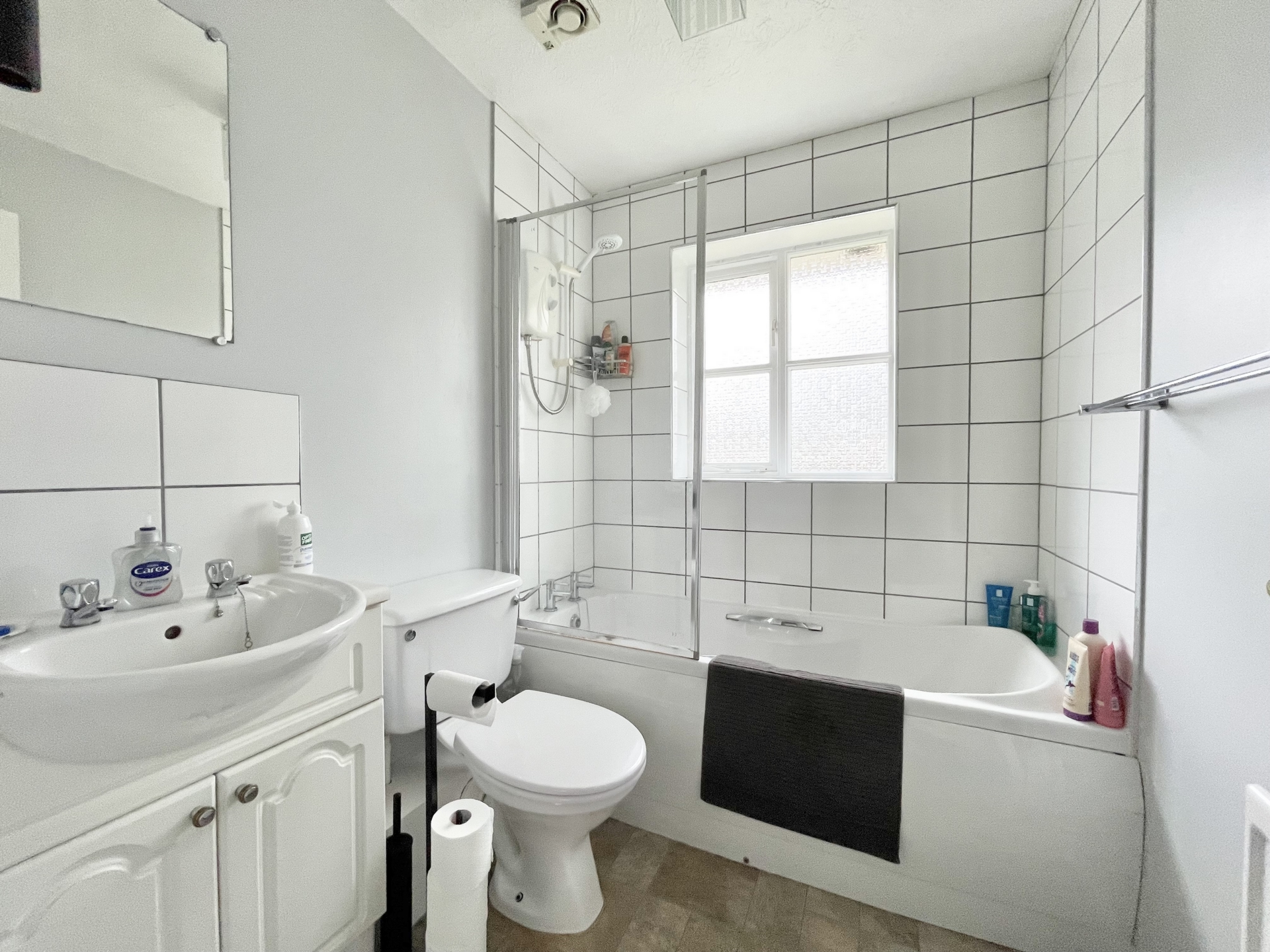 BATHROOM: Close coupled WC, wash hand basin with storage cupboard under, panelled bath with electric shower over, radiator, double glazed window to the rear.