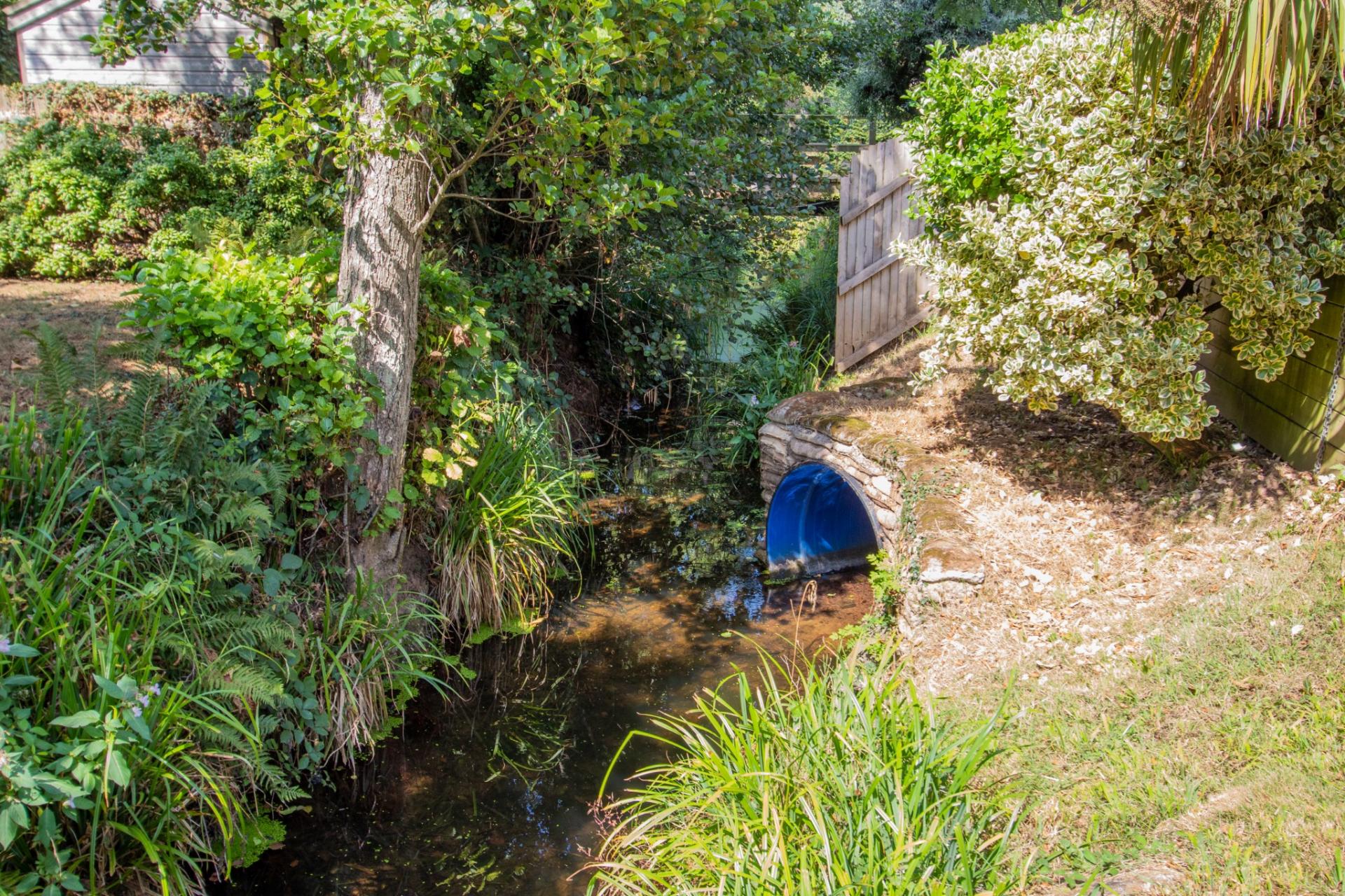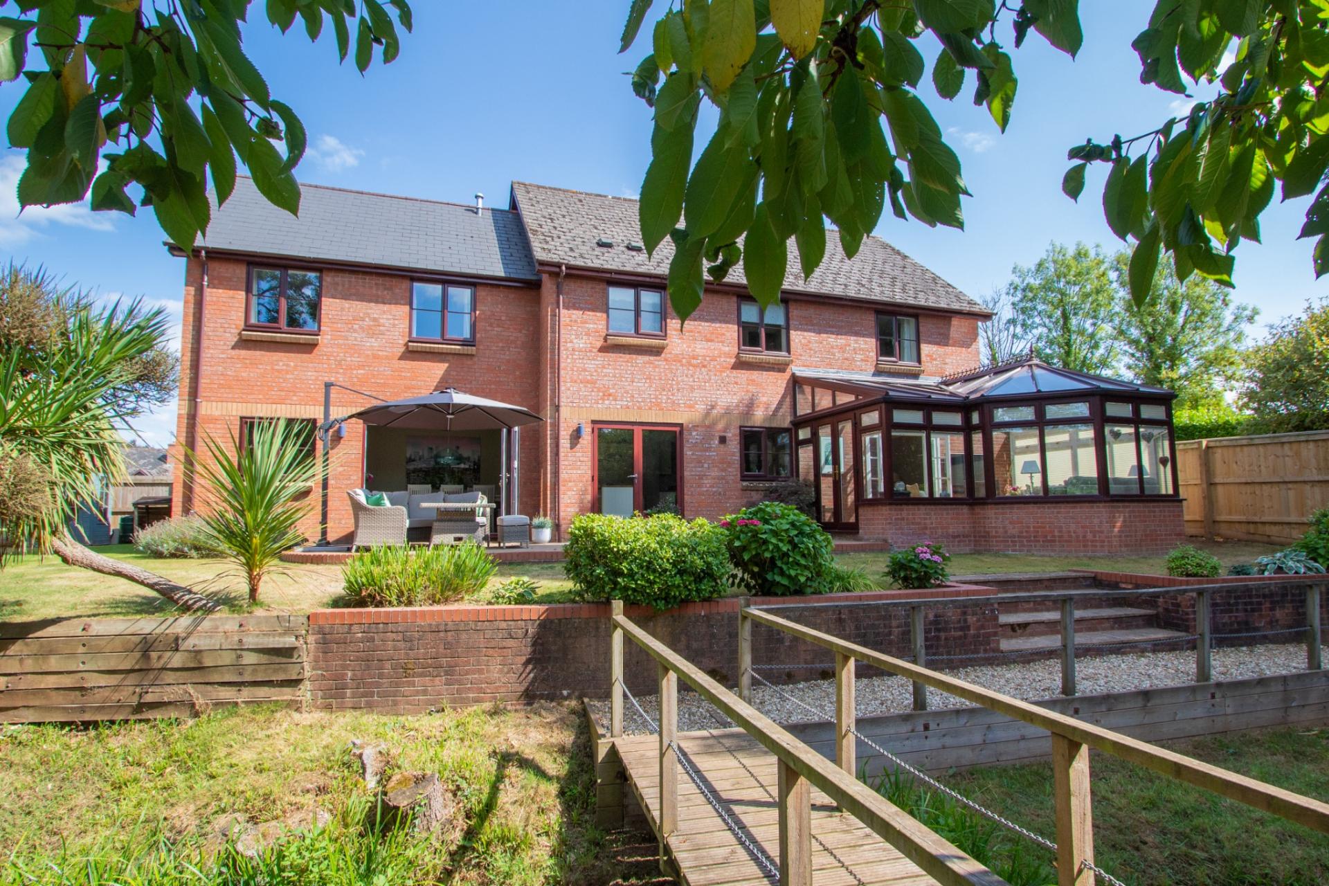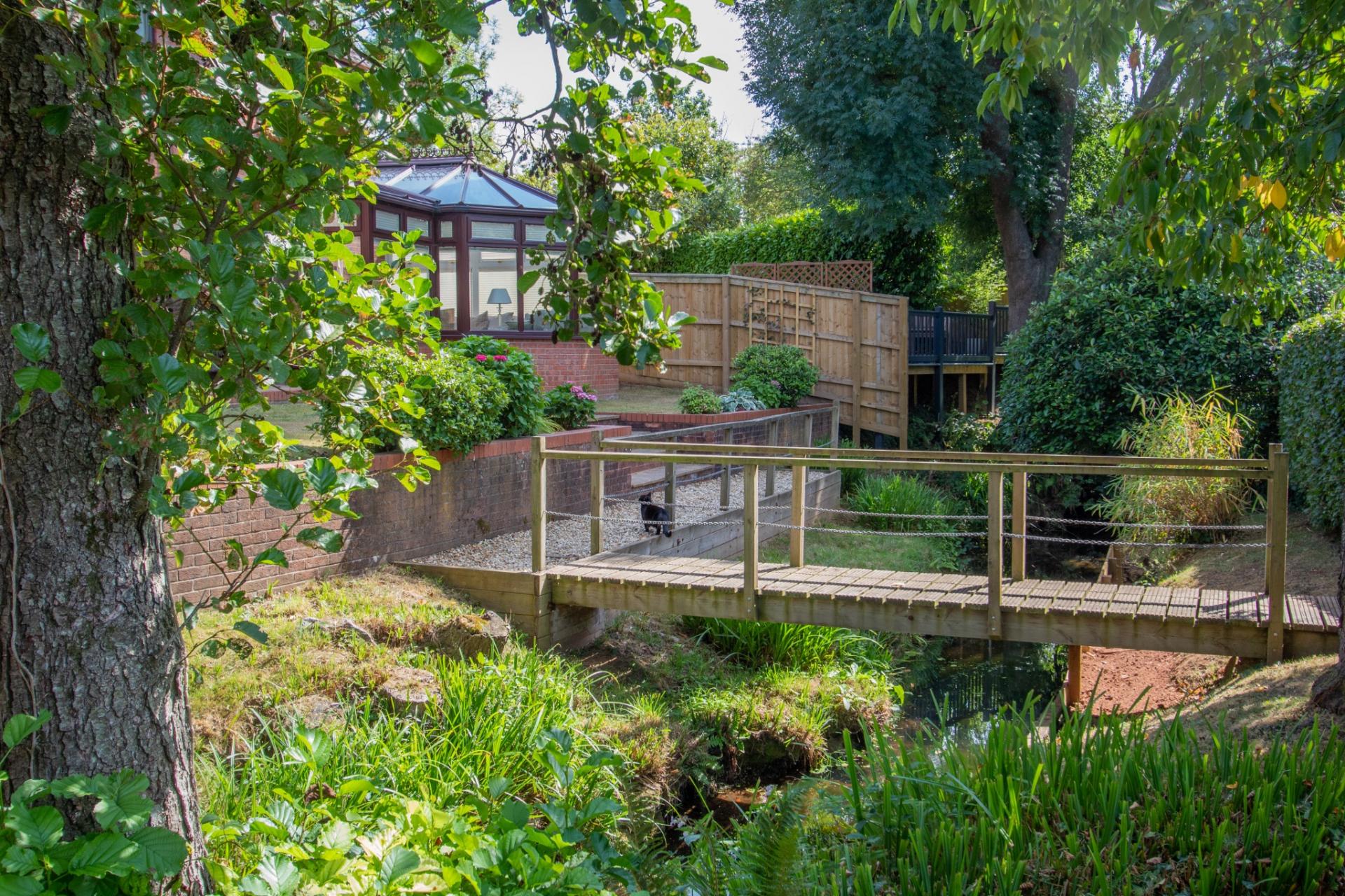 To the front, the property is approached via a generous driveway with a hammerhead turning area, attractively landscaped and well-planted to create a welcoming approach. The rear garden enjoys a sunny, secluded aspect with thoughtfully arranged patio areas provide ideal spaces for outdoor dining and relaxation, surrounded by colourful and mature flowering borders. A charming feature stream, complete with a bridge, leads to a further area of garden, adding character and a sense of tranquillity to this delightful outside space.