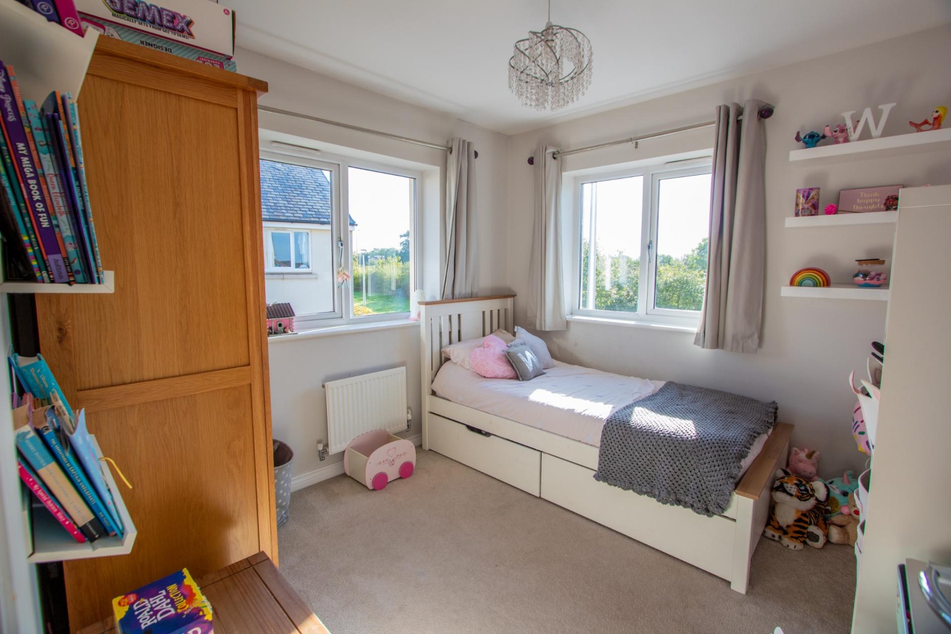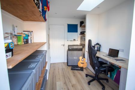 To the front, the garden is laid to lawn with a gate providing access to the rear. There is driveway parking for two cars along with a garage and EV charger. The rear garden is fully enclosed and enjoys a good degree of privacy, featuring a patio area, lawn, and access to the converted study — ideal for working from home. The garage also offers useful storage, enhanced by the added benefit of loft space.