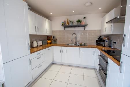 Upon entering, you’re welcomed by a spacious entrance hall which leads into the modern fitted kitchen/diner — a bright and airy room enjoying dual-aspect windows. The kitchen is well-equipped with integrated appliances including a fridge/freezer, dishwasher, washing machine, double oven, and electric hob.