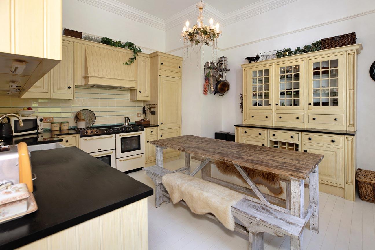 KITCHEN/DINING ROOM: Matching base and eye level units with inset Belfast style sink, space for a range style cooker, display cabinets, plate racks, radiator, picture rail and window to the rear looking onto the communal grounds.