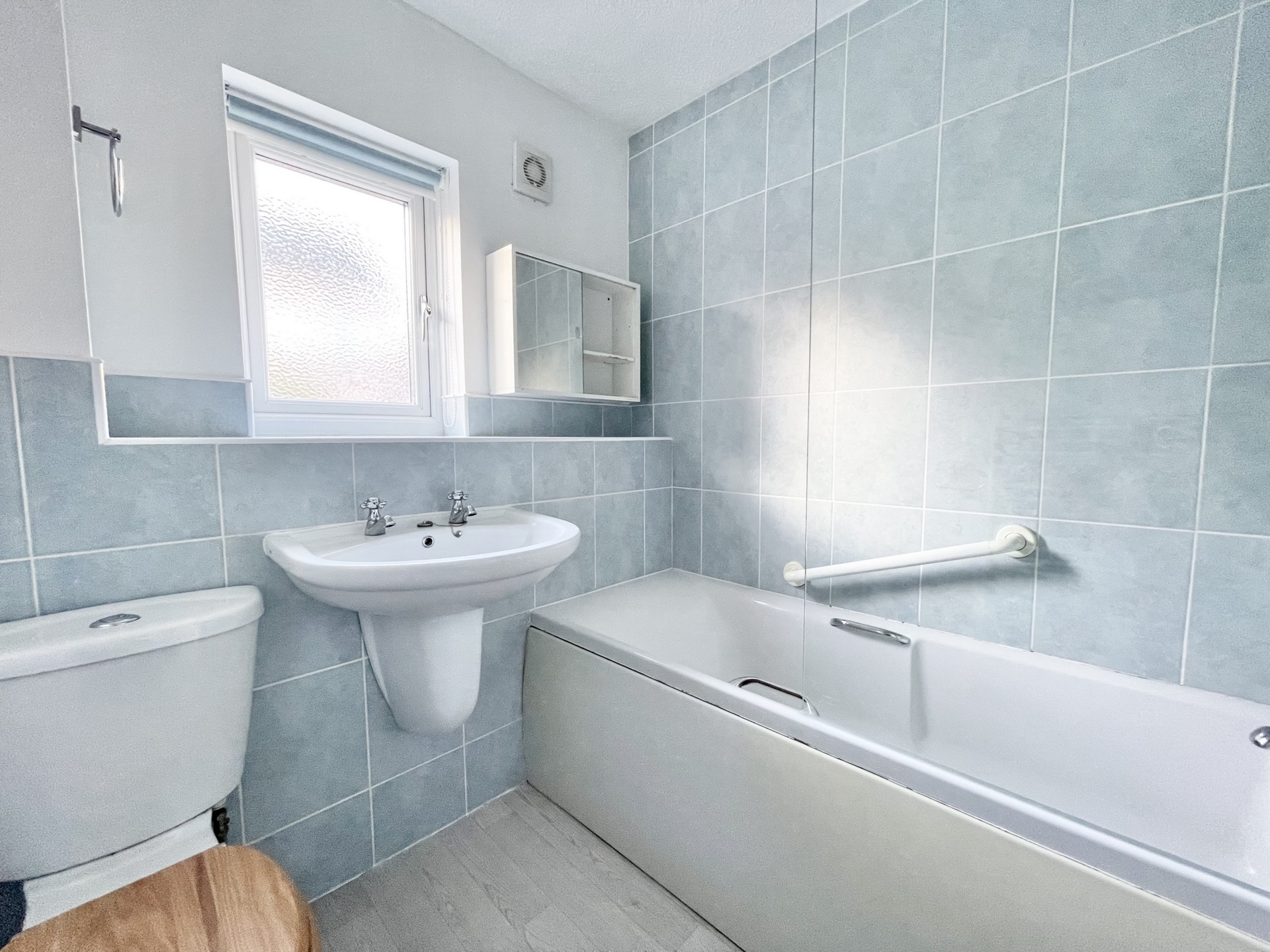 BATHROOM: Close coupled WC, wash hand basin, panelled bath with shower attachment, heated towel rail, obscure double glazed window to the side.