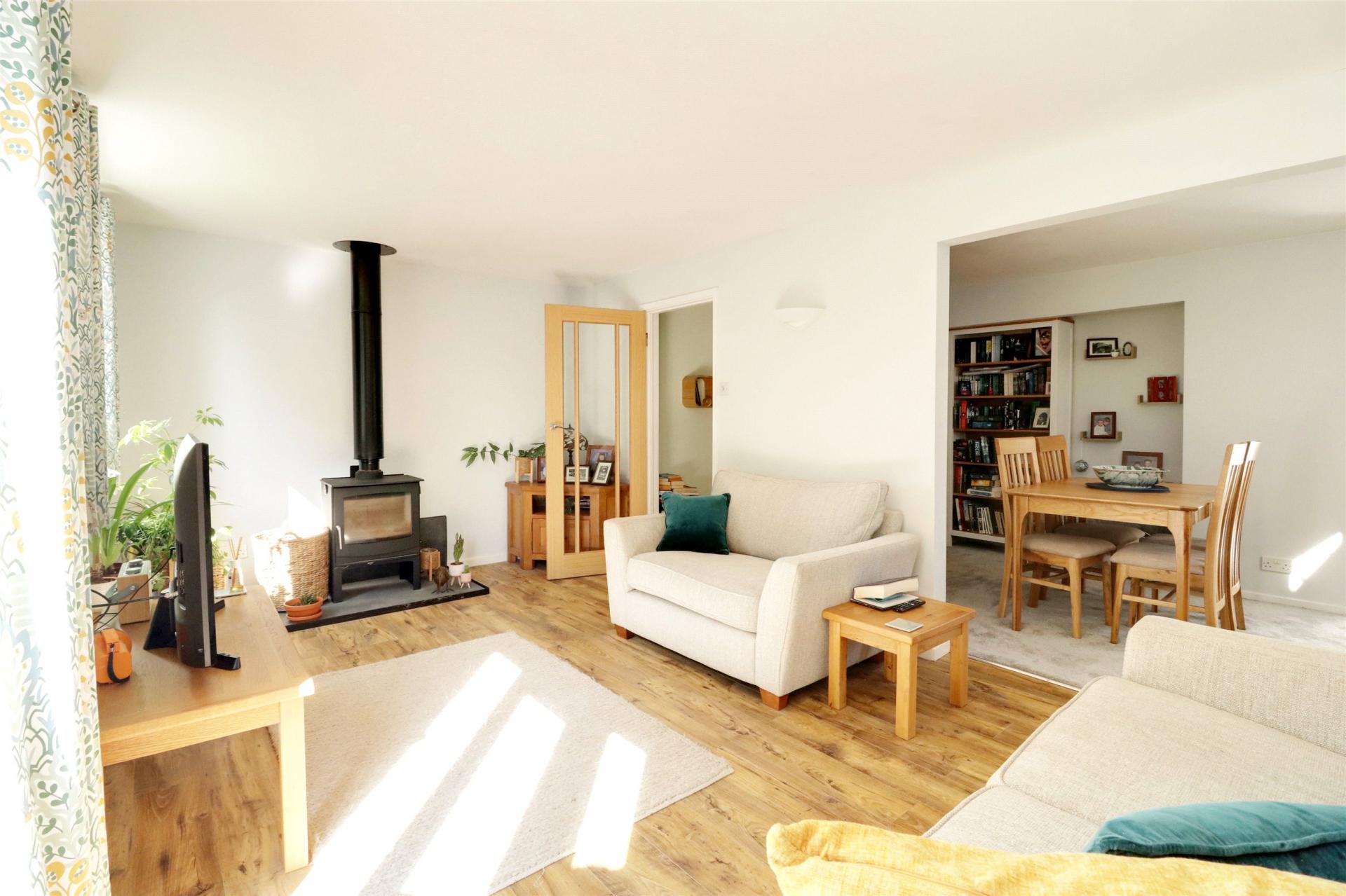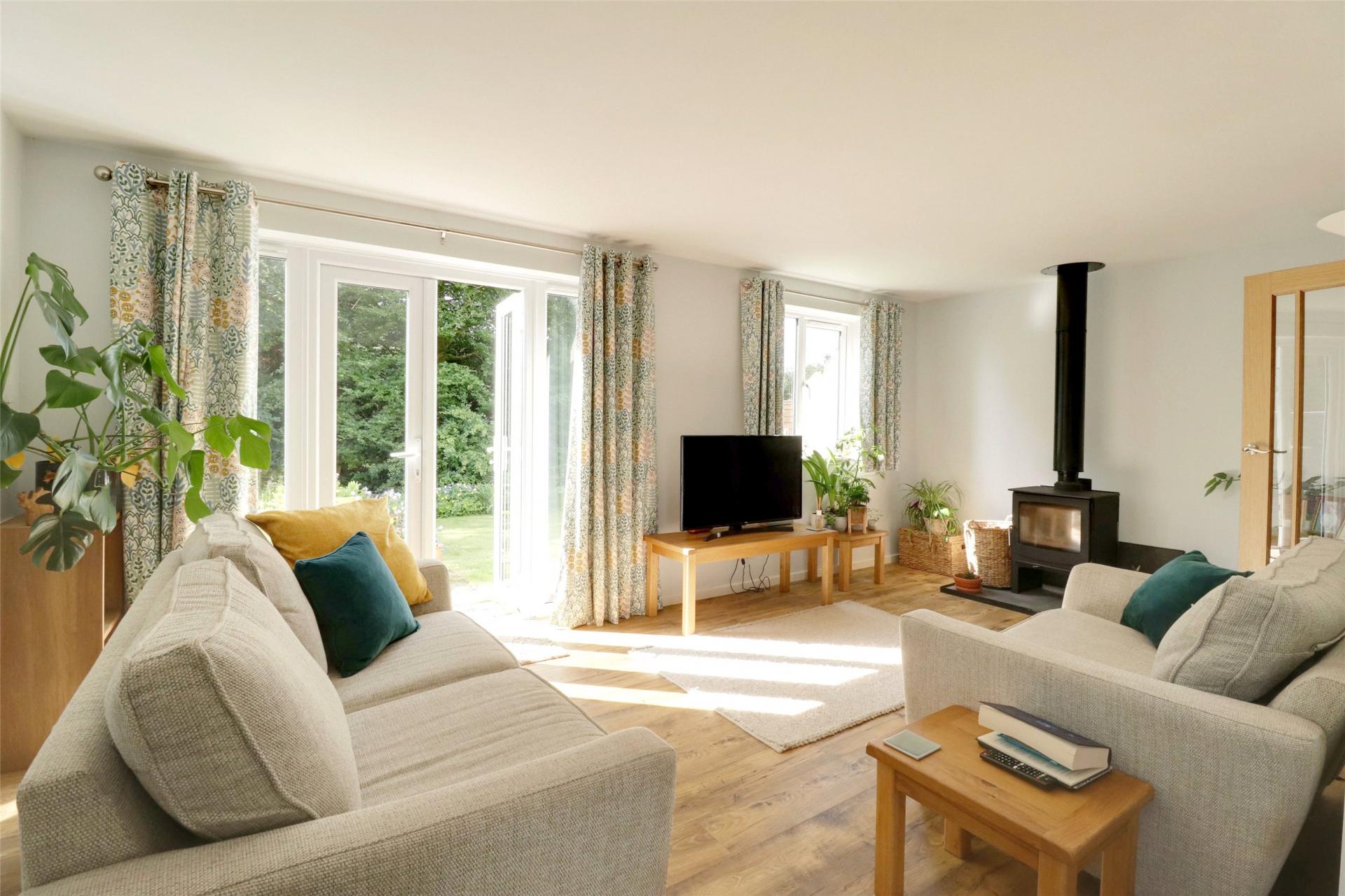 The open-plan sitting/dining room offers a beautiful, light-filled, and comfortable space with flexible uses throughout the home. The sitting area features patio doors that open to the rear garden, as well as a Woodwarm multi-fuel burning stove set on a slate hearth.