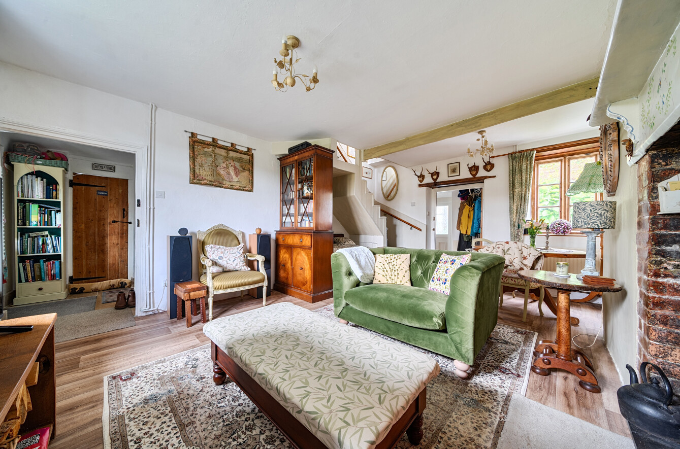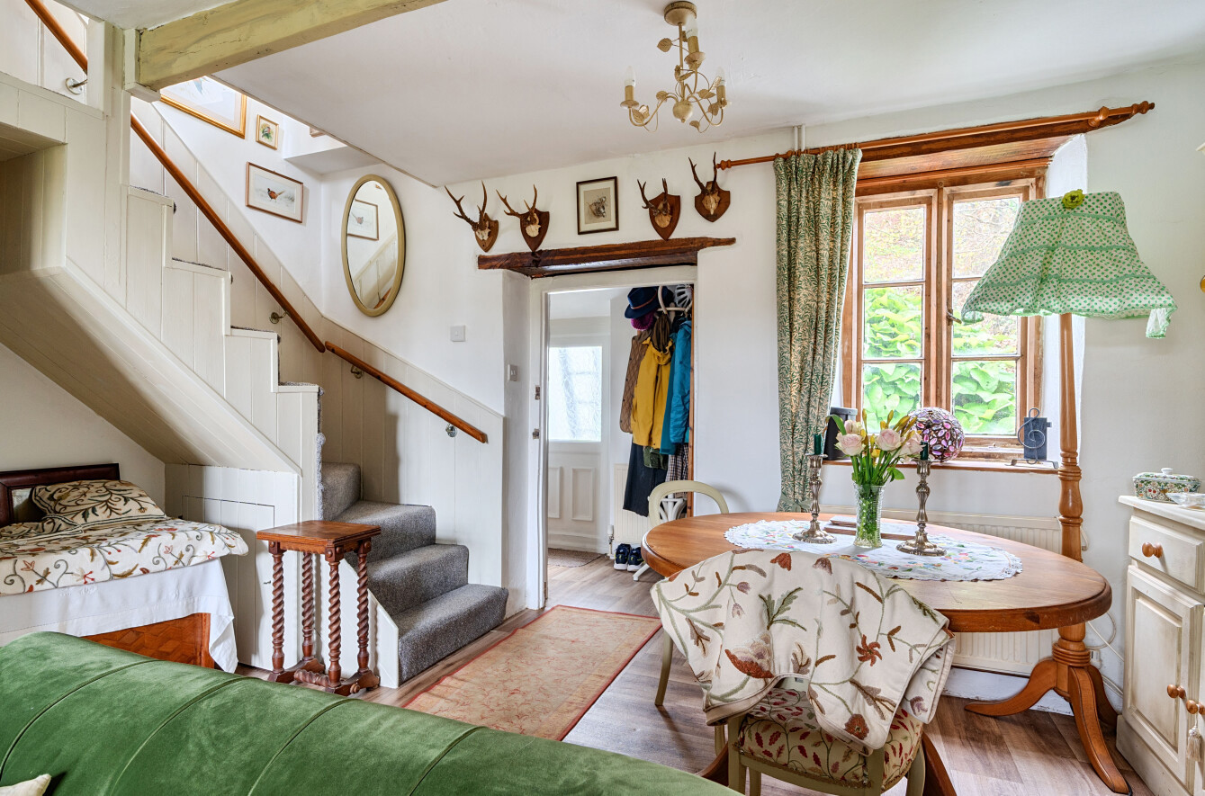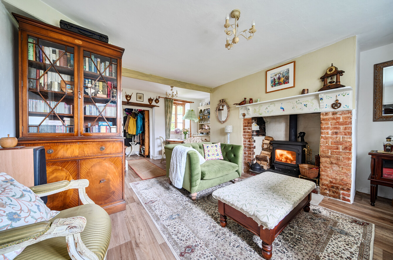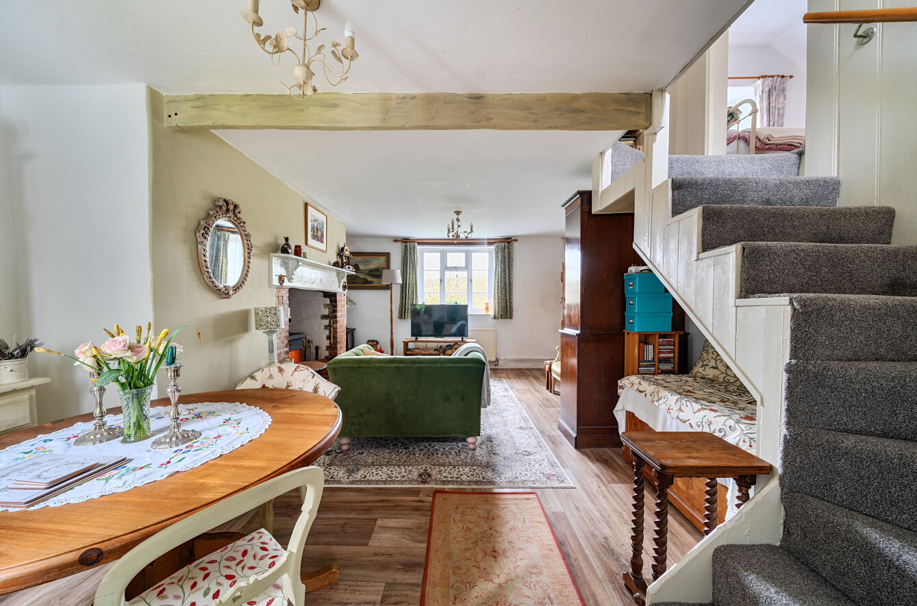 The sitting room is a spacious and welcoming room with an open feel, featuring a beautiful inglenook style fireplace with inset wood burning stove. The room enjoys a double aspect, allowing for plenty of natural light, and offers ample space for a dining table. Stairs rise from here to the first floor.