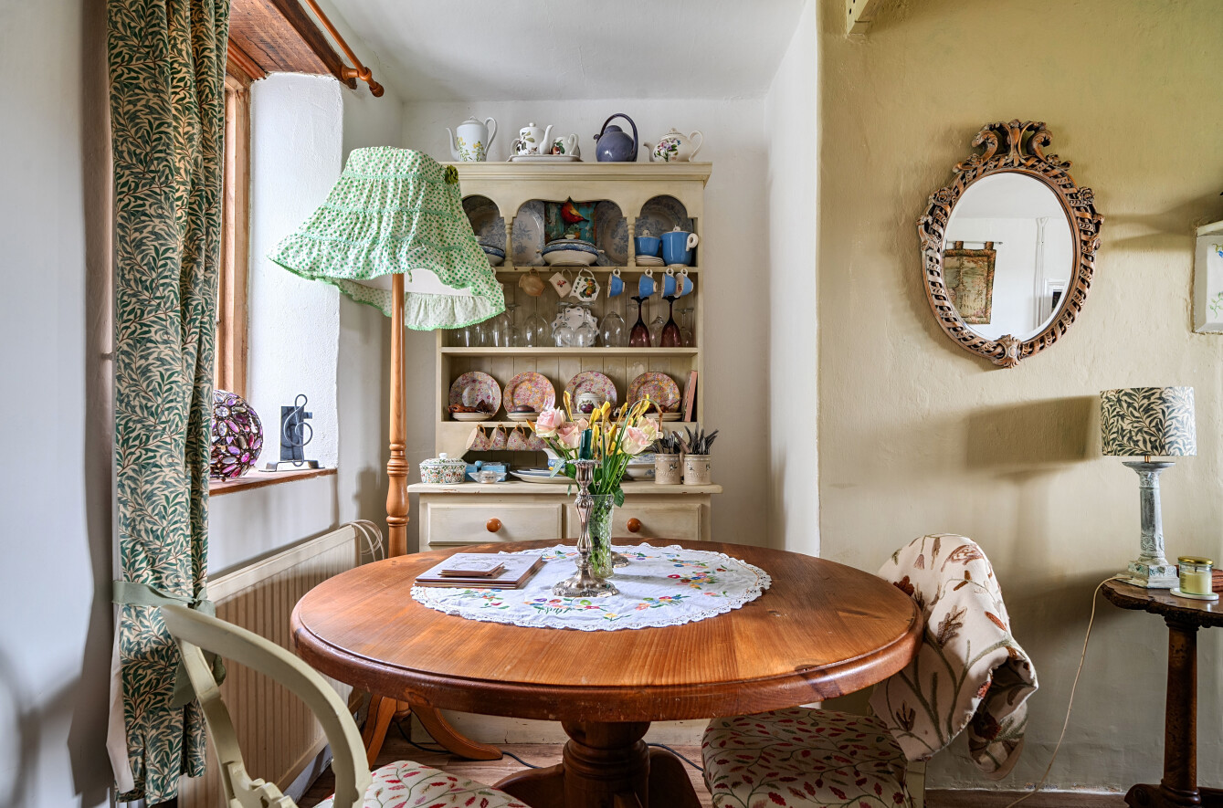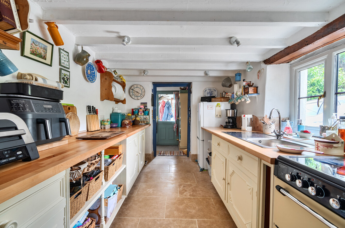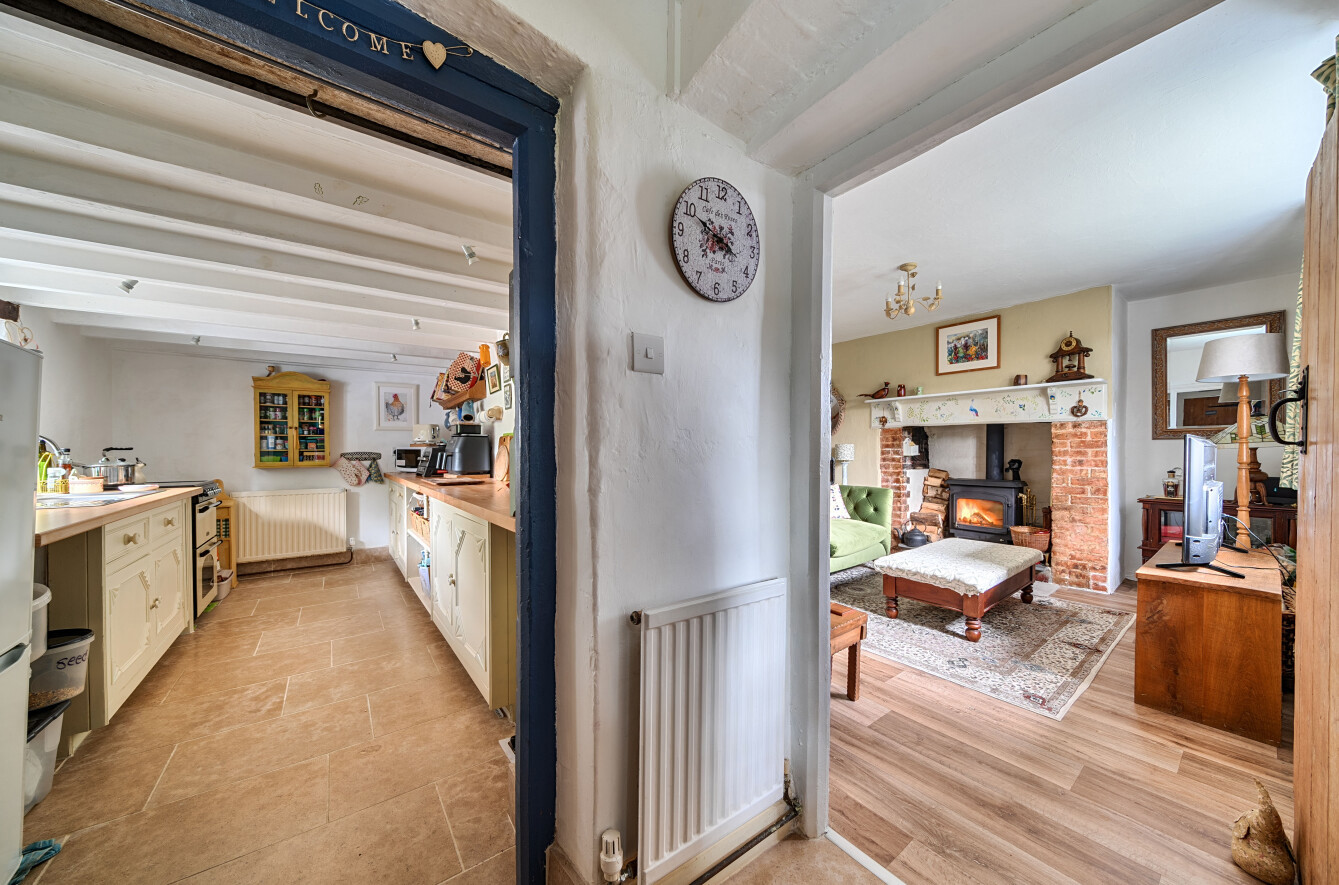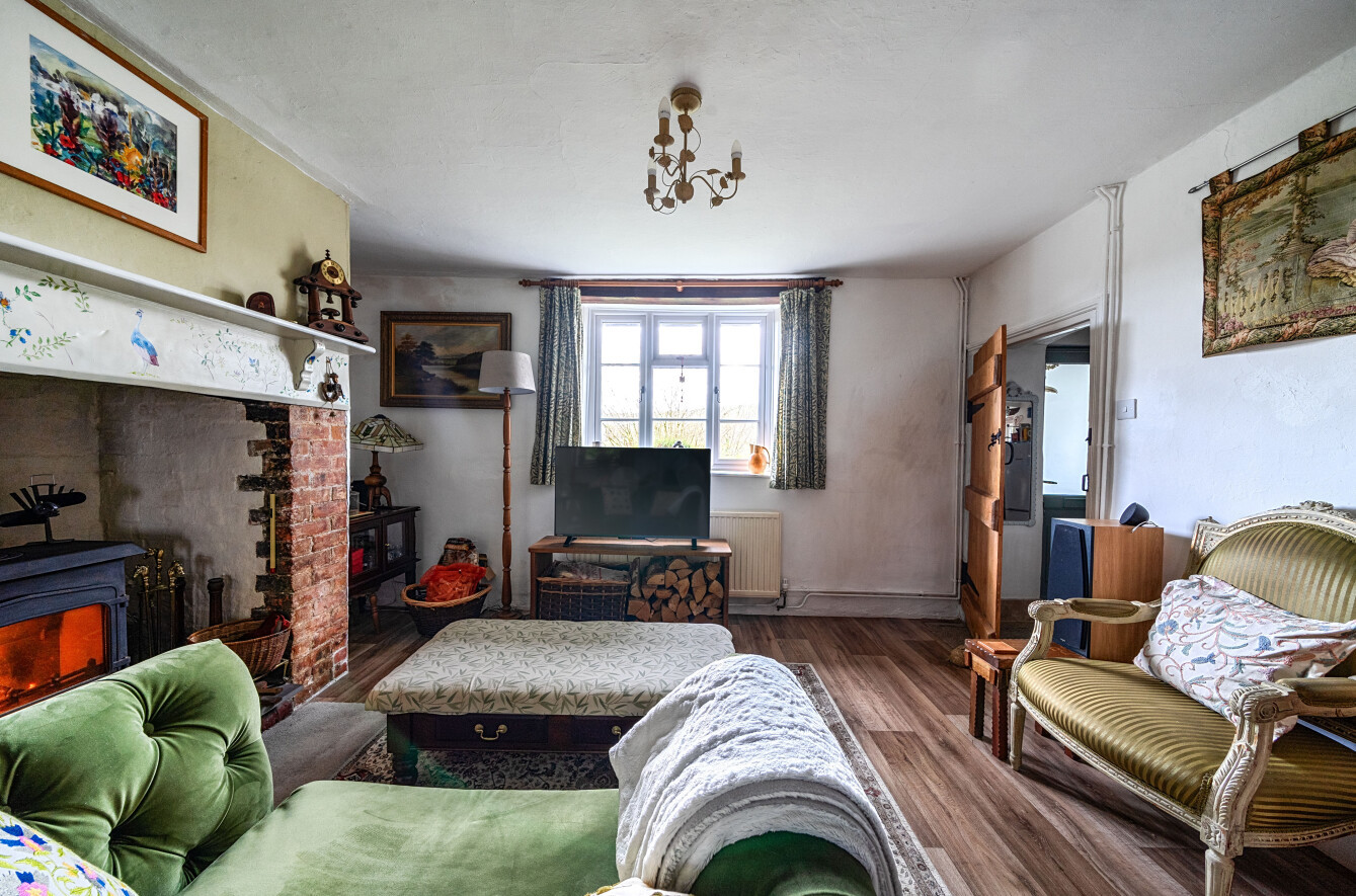 The sitting room is a spacious and welcoming room with an open feel, featuring a beautiful inglenook style fireplace with inset wood burning stove. The room enjoys a double aspect, allowing for plenty of natural light, and offers ample space for a dining table. Stairs rise from here to the first floor.