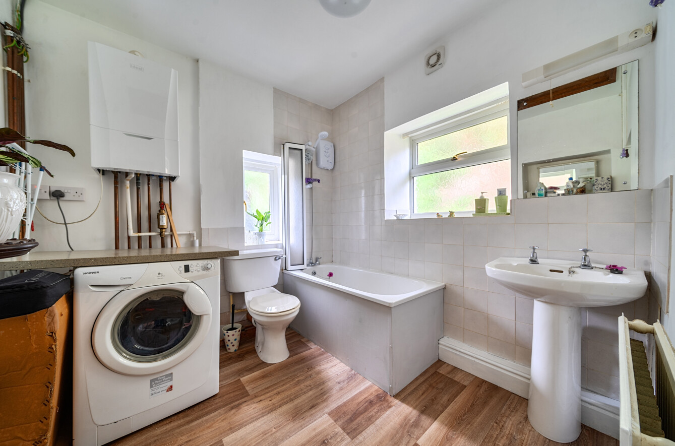 Continuing on the ground floor, the property benefits from a rear access door and a downstairs bathroom, which includes plumbing for a washing machine.