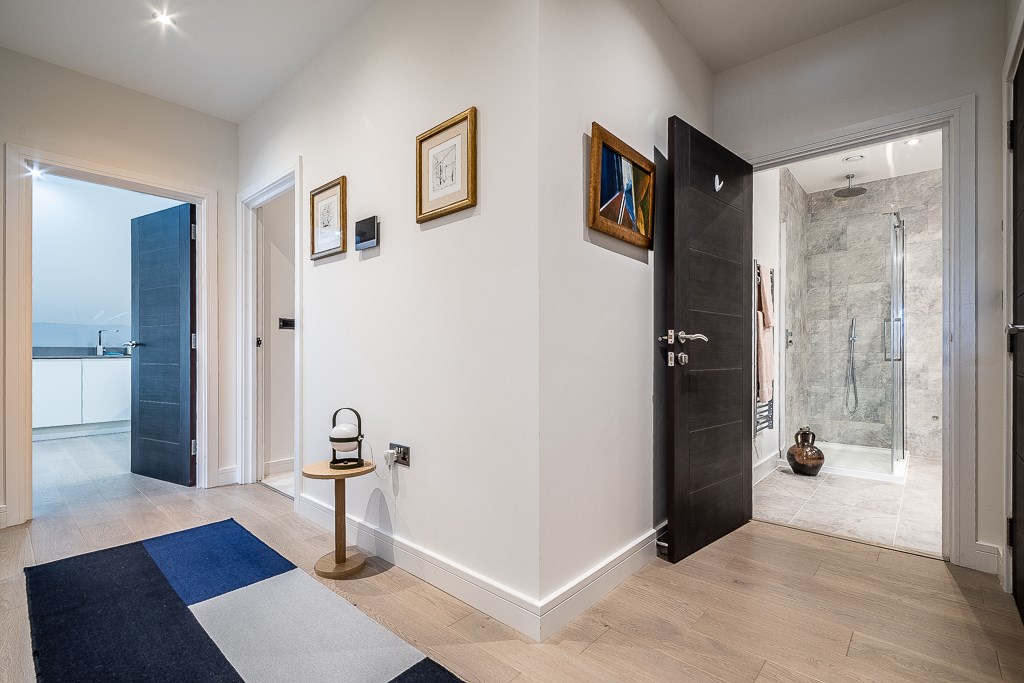 Apartment 9, is a spacious three bedroom penthouse apartment (second floor), finished to a high specification, with open plan living/dining and kitchen area with built in AEG kitchen appliances, master bedroom accommodating a custom built dressing room and en suite, family bathroom with separate bath and shower.