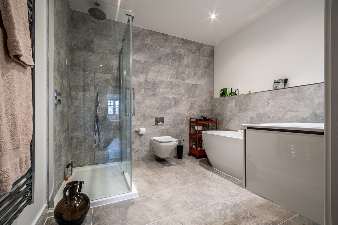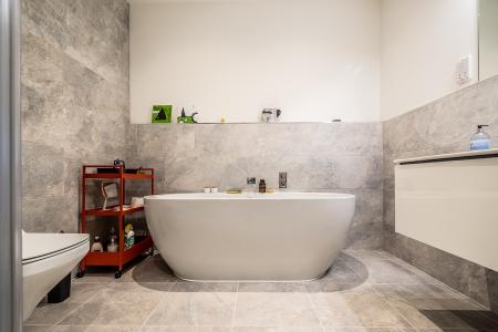 Fitted with a white suite comprising stand-alone bath with chrome furnishings and mixer tap, wall mounted wash hand basin in vanity unit with chrome mixer tap, part tiled walls and mirror over, shaver socket and strip light. Chrome towel radiator, shower cubicle with glazed shower screen door and a chrome rain showerhead and fully tiled walls, WC with concealed cystern and chrome flush, chrome accessories, tiled flooring and sensor lighting.