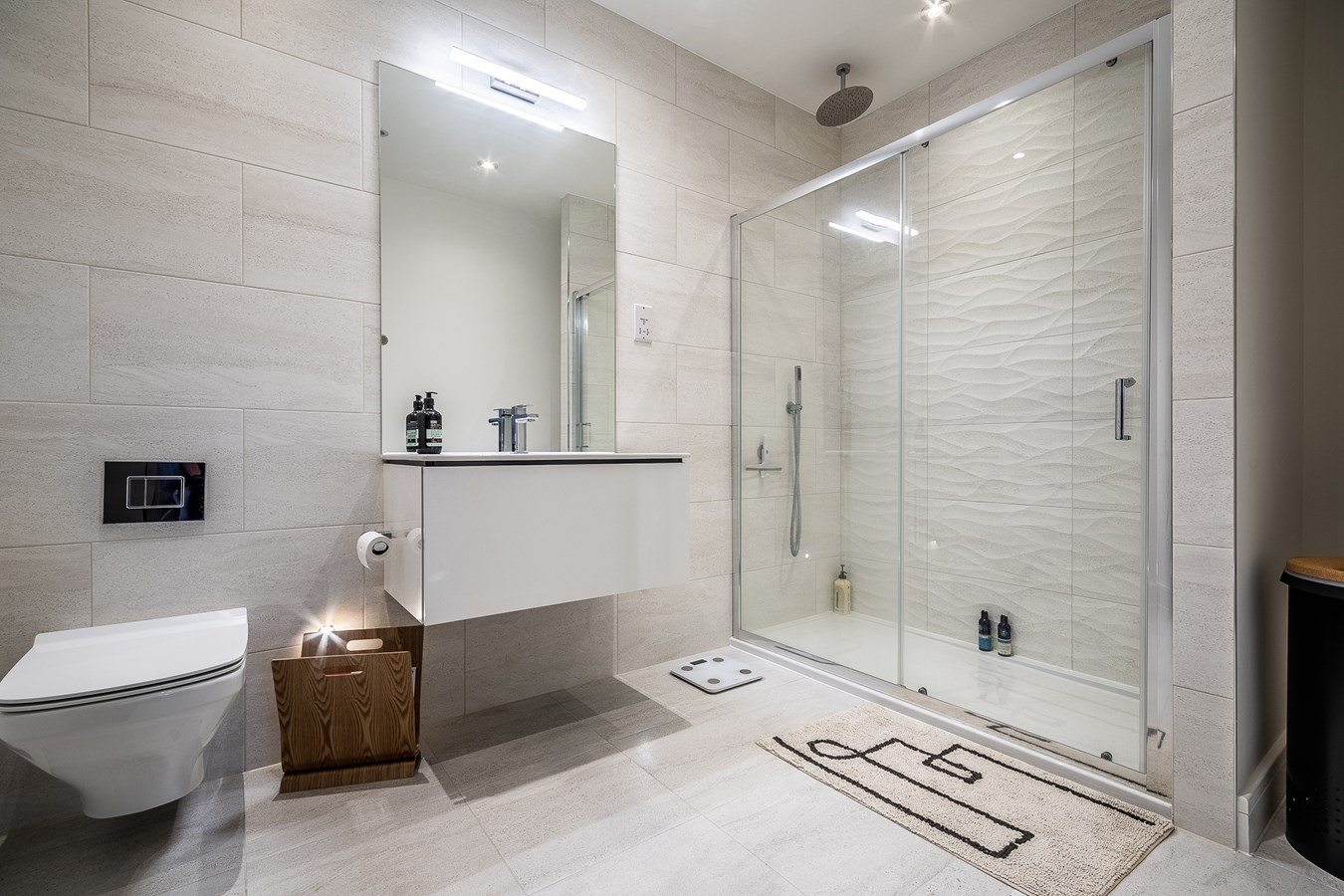 Beautifully fitted with a white suite comprising fully tiled walls and walk-in double shower cubicle with glazed shower doors and chrome furnishings. Chrome rain shower head, spotlighting. Wash hand basin with vanity unit under and chrome mixer tap, WC with concealed cistern and chrome flush. Chrome wall mounted towel radiator, tiled floor, sensor lighting, large mirror and a fluorescent strip light.