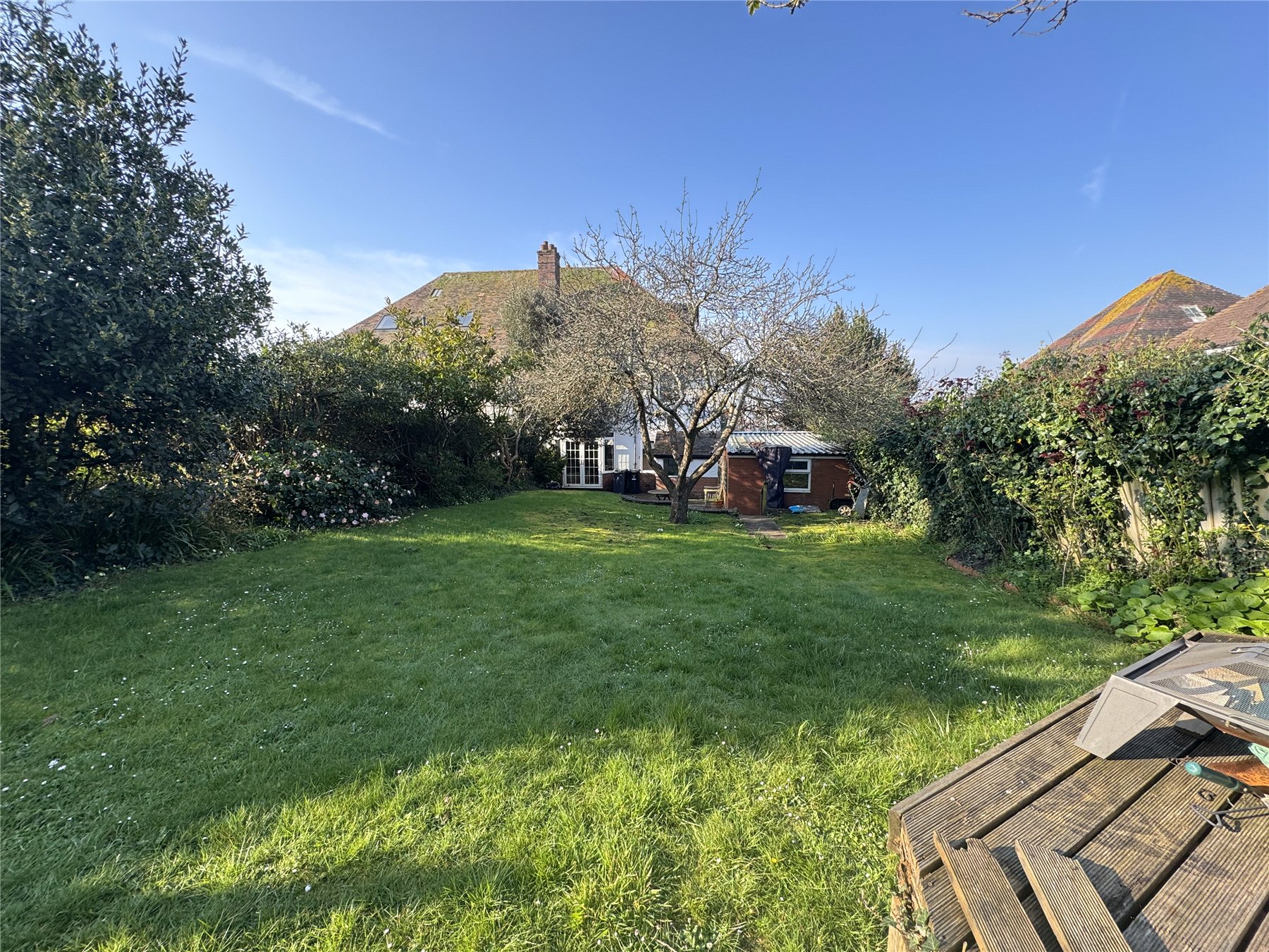 Outside, the rear garden extends approximately 70 feet, mainly laid to lawn, offering a good degree of privacy and great outdoor space. A large patio area connected to the French doors provides a perfect spot for alfresco dining and relaxing. The property also benefits from a garage and driveway with parking for multiple vehicles.