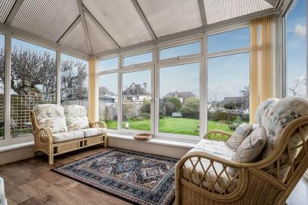 Outside, the gardens are a lovely feature of the house, the front being approached via a driveway from Halsdon Avenue. The front garden is bounded by a brick perimeter wall with a mature shrubs providing an excellent level of colour and privacy. The driveway provides parking for several cars and in turn leads to a detached single garage. The rear garden offers a lovely expanse of south facing lawned gardens complete with a pond and greenhouse. It is bounded by perimeter fencing, herbaceous border and mature trees. Directly abutting the rear elevation is a paved sun terrace which is accessed via the patio doors from the conservatory.