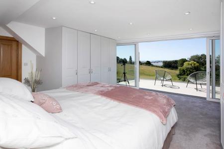 The ground floor has a spacious sitting room with French doors opening onto a west-facing balcony with estuary views, while adjoining the sitting room is a dining room with a vaulted ceiling, a large bay window taking in the same view and French doors opening onto the elevated terrace. The kitchen and breakfast room has sleek, contemporary units and integrated appliances, plus French doors opening onto the rear gardens.
