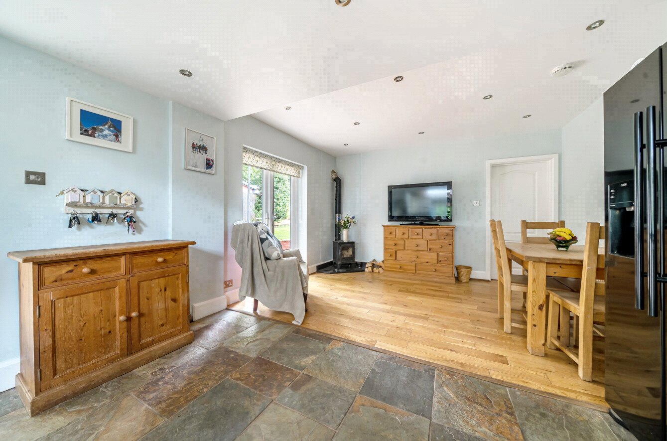 This space is flooded with natural light via large windows, skylights and French doors providing access to the garden. In addition, there is wood burner and ample space for a breakfast table. Completing the ground floor is a 20 ft dual aspect formal dining room with wood flooring and views over the delightful garden creating an ideal space for entertaining!