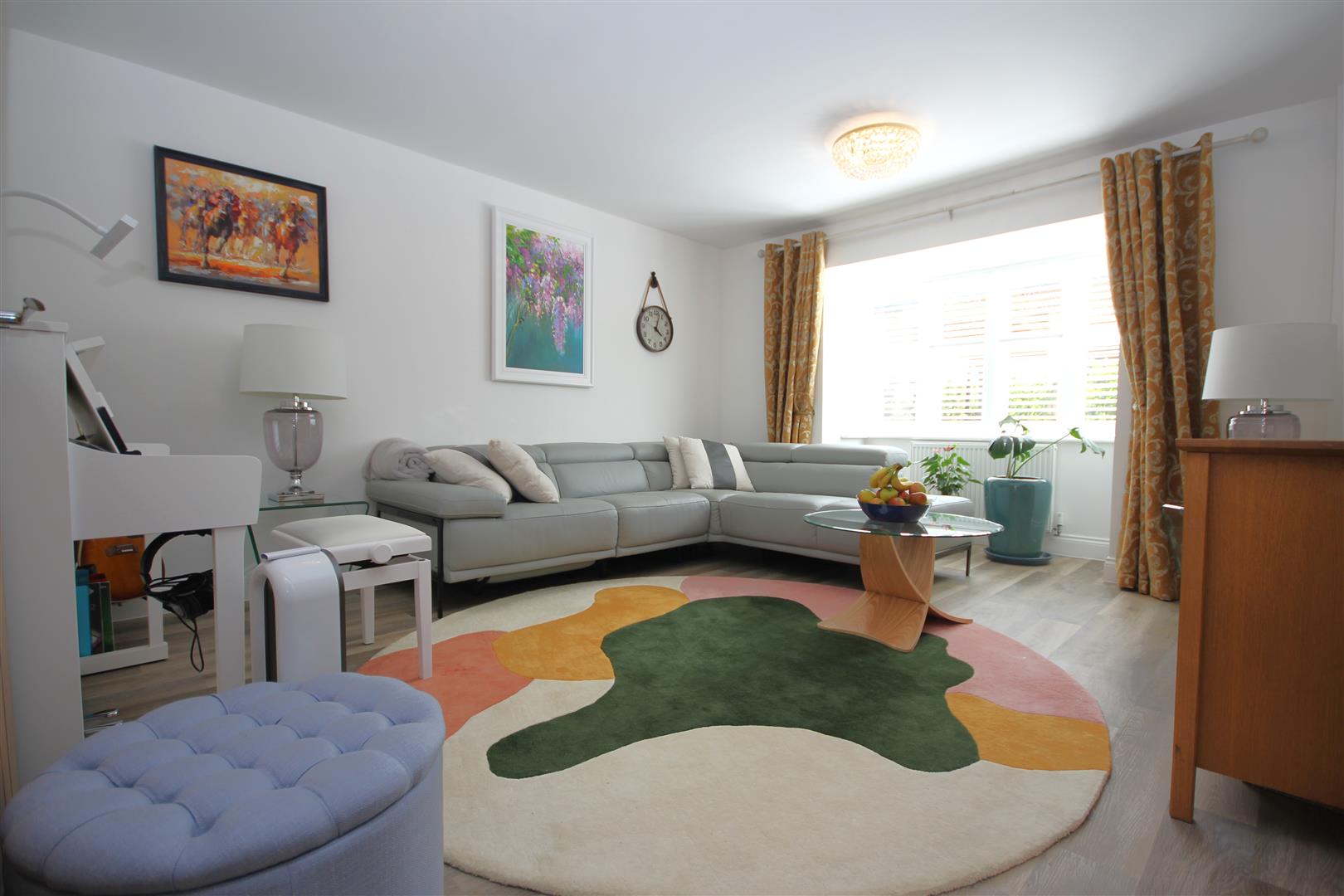 Spacious lounge with walk in bay window fitted with made to measure shutters to remain