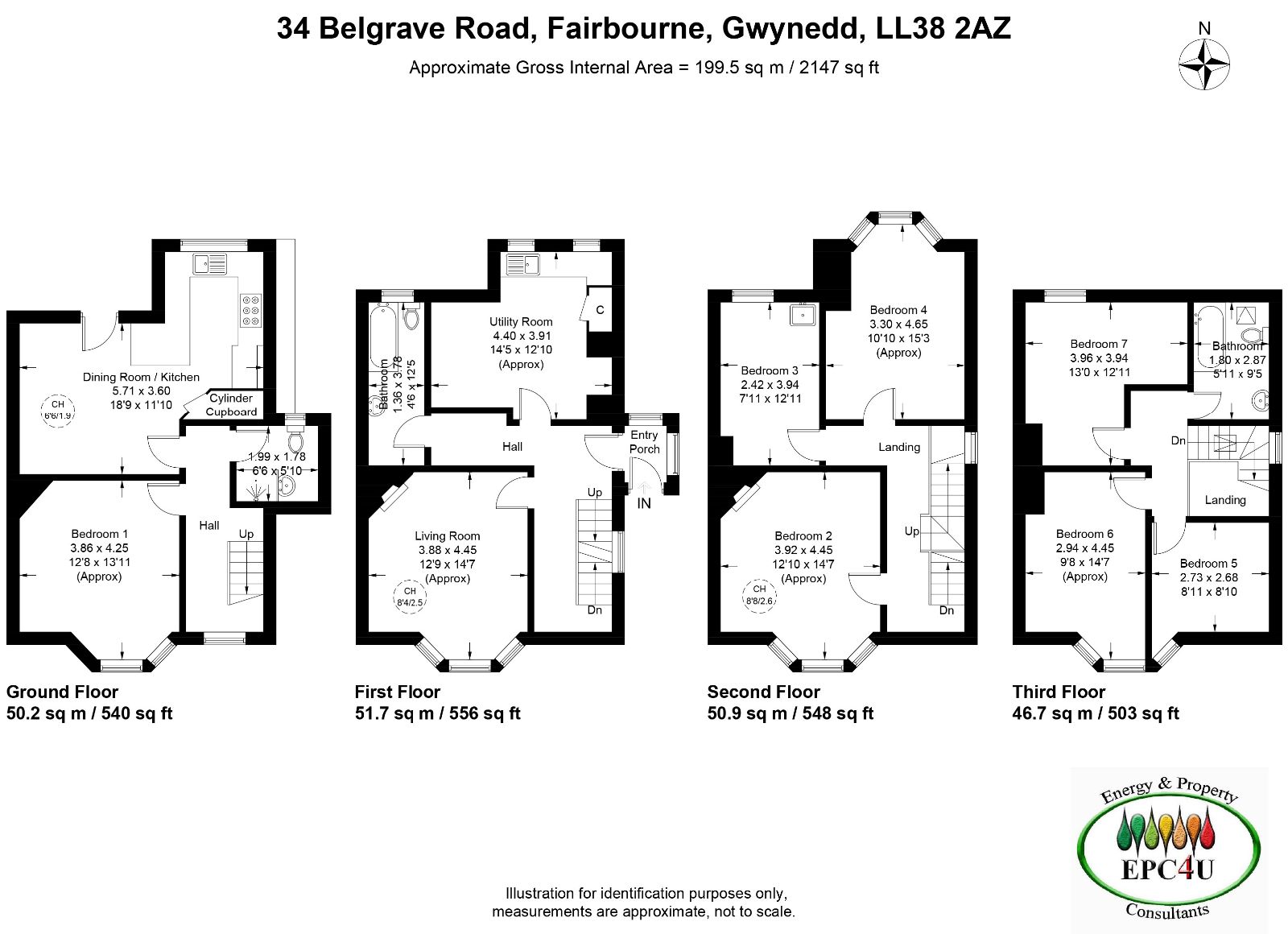 Second Floor - Landing, bedrooms 5, 6, and 7, along with a bathroom