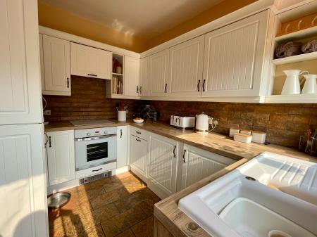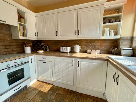 Door and window to rear, 9 wall units, 8 base units under a timber effect worktop, brick tiled splash back, 1 1/4 ceramic sink and drainer, integral oven, integral ceramic hob, extractor hood above, integral fridge and freezer, tiled flooring.