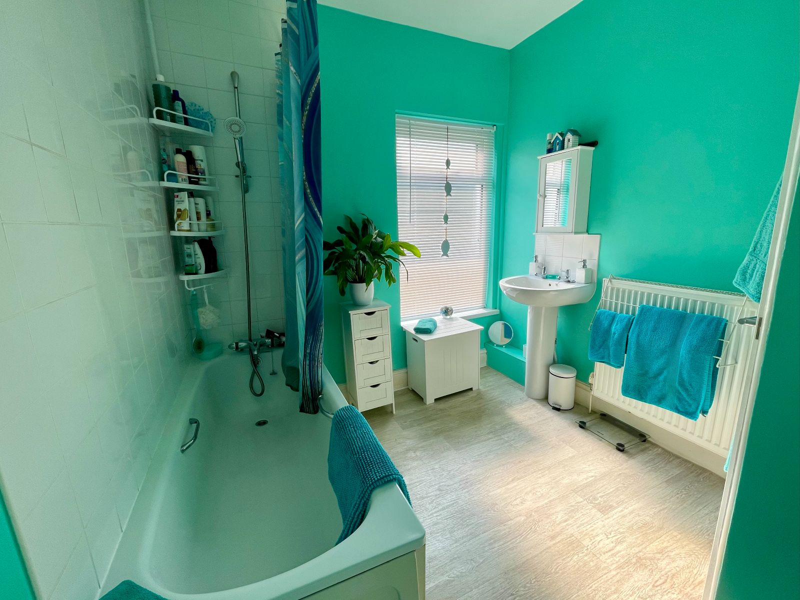 Window to rear and side, white bathroom suite consisting of panel bath with mixer shower attachment, pedestal wash hand basin, tiled splash backs, low level WC, radiator, cushion flooring.