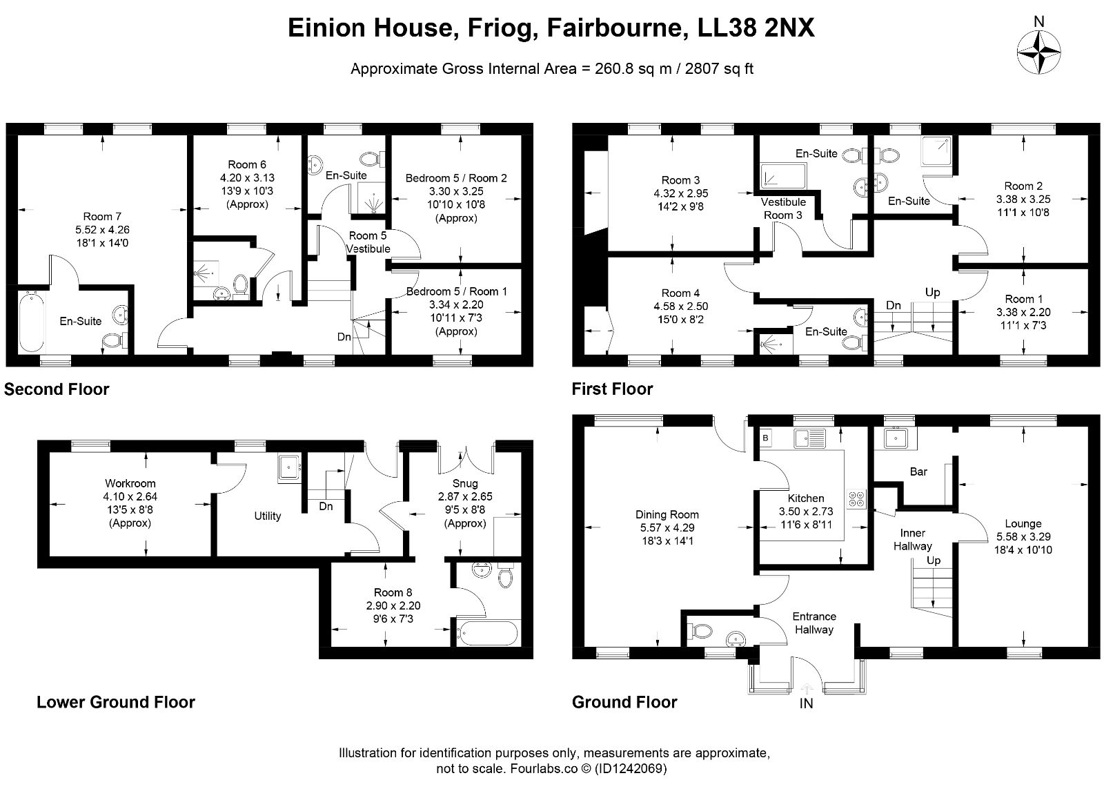 Lower Ground Floor - Accessible from the rear or via an internal staircase, comprising hallway, sitting room leading to bedroom, bathroom, workroom, and laundry room.