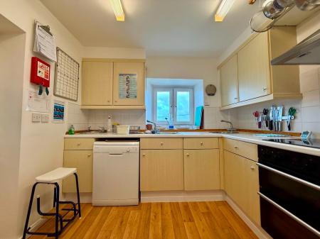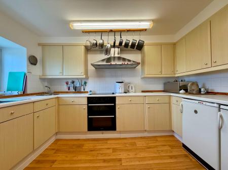 Window to rear, 9 wall units, 7 base units under worktops, tiled splash backs, 1 1/4 stainless steel sink and drainer, circular stainless steel sink, integral double oven with ceramic hob and extractor hood above, space for dishwasher, space for undercounter freezer and 2 under counter fridge's, radiator, cushion flooring.