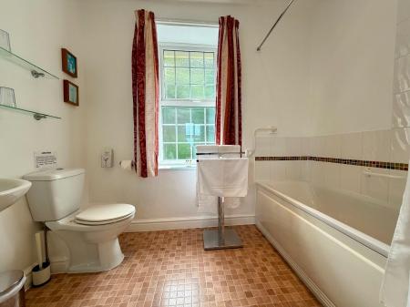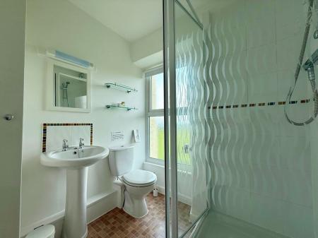 Window to rear, fully tiled shower cubicle with mains shower, extractor fan, low level W.C., pedestal wash hand basin, mirror with shaver socket and light above, radiator, cushion flooring.