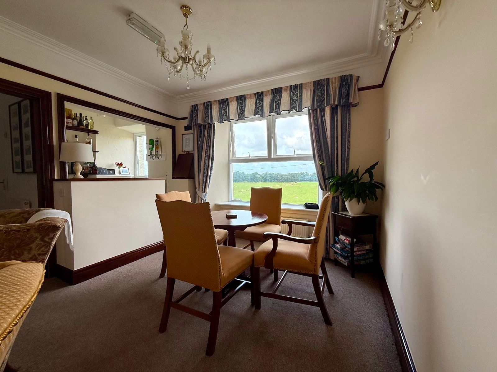 Bar Area with counter space with 1 base unit below and space for under counter fridge, enamel sink and drainer, 2 radiators, carpet.