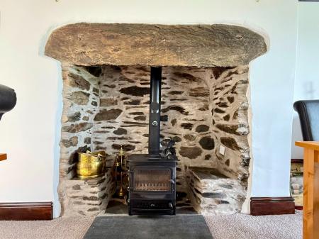 Window to front, window to rear with far distant views towards Barmouth, door to rear, exposed beams, picture rail, wall lights, open feature fireplace with exposed slate lintel housing a multifuel stove on a slate hearth, radiator, carpet.
