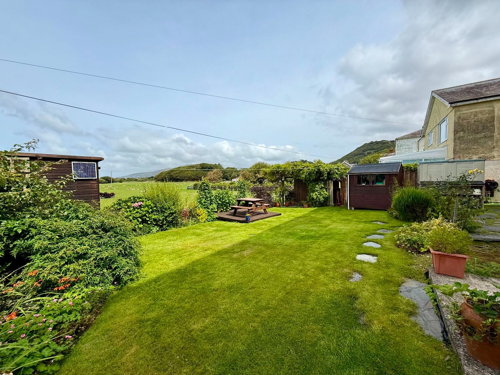 Within the garden, there is also a practical insulated storage shed/workshop with power and lighting, together with the oil tank.