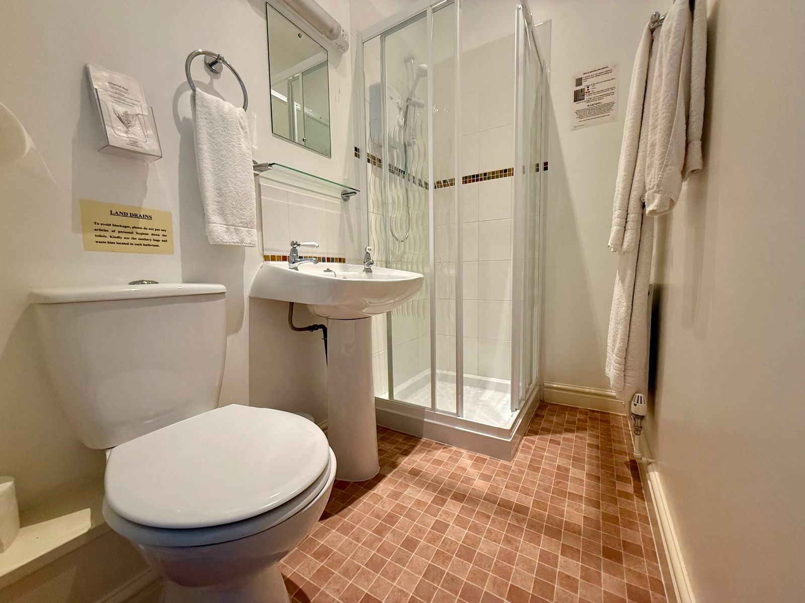 Fully tiled shower cubicle with electric shower, extractor fan, pedestal wash hand basin, low level W.C, mirror with shaver socker and light above, radiator, cushion flooring.