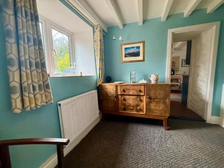 Window to front, door to rear, window to rear, feature slate open fireplace housing woodburning stove, exposed beams, built in cupboard, 2 radiators, oak flooring.