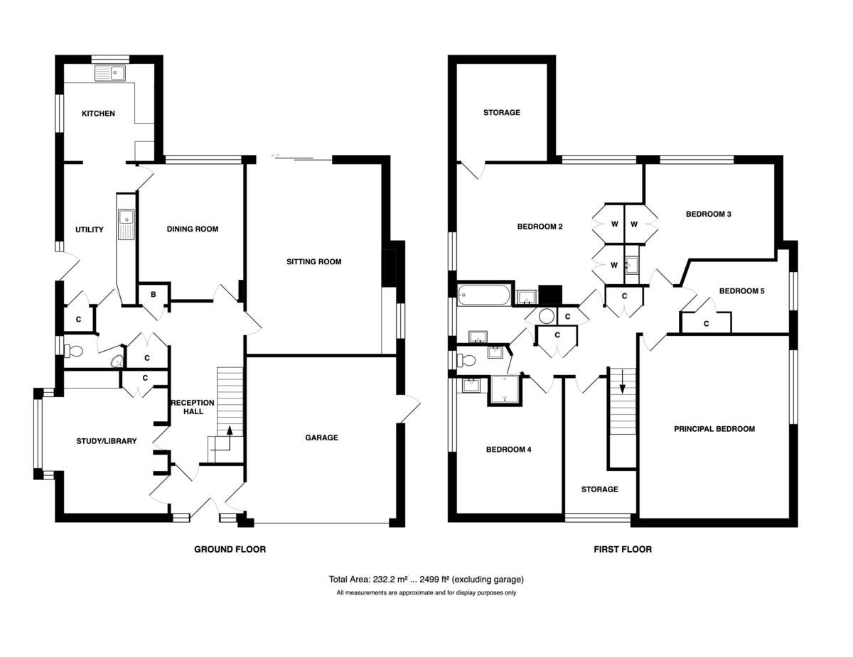 Upstairs, the light-filled first floor extends over the large garage, providing five bedrooms. Two of these are particularly spacious, and three benefit from their own hand basins and built-in wardrobes. A family bathroom, separate shower room, and a useful storage room complete the upper level.