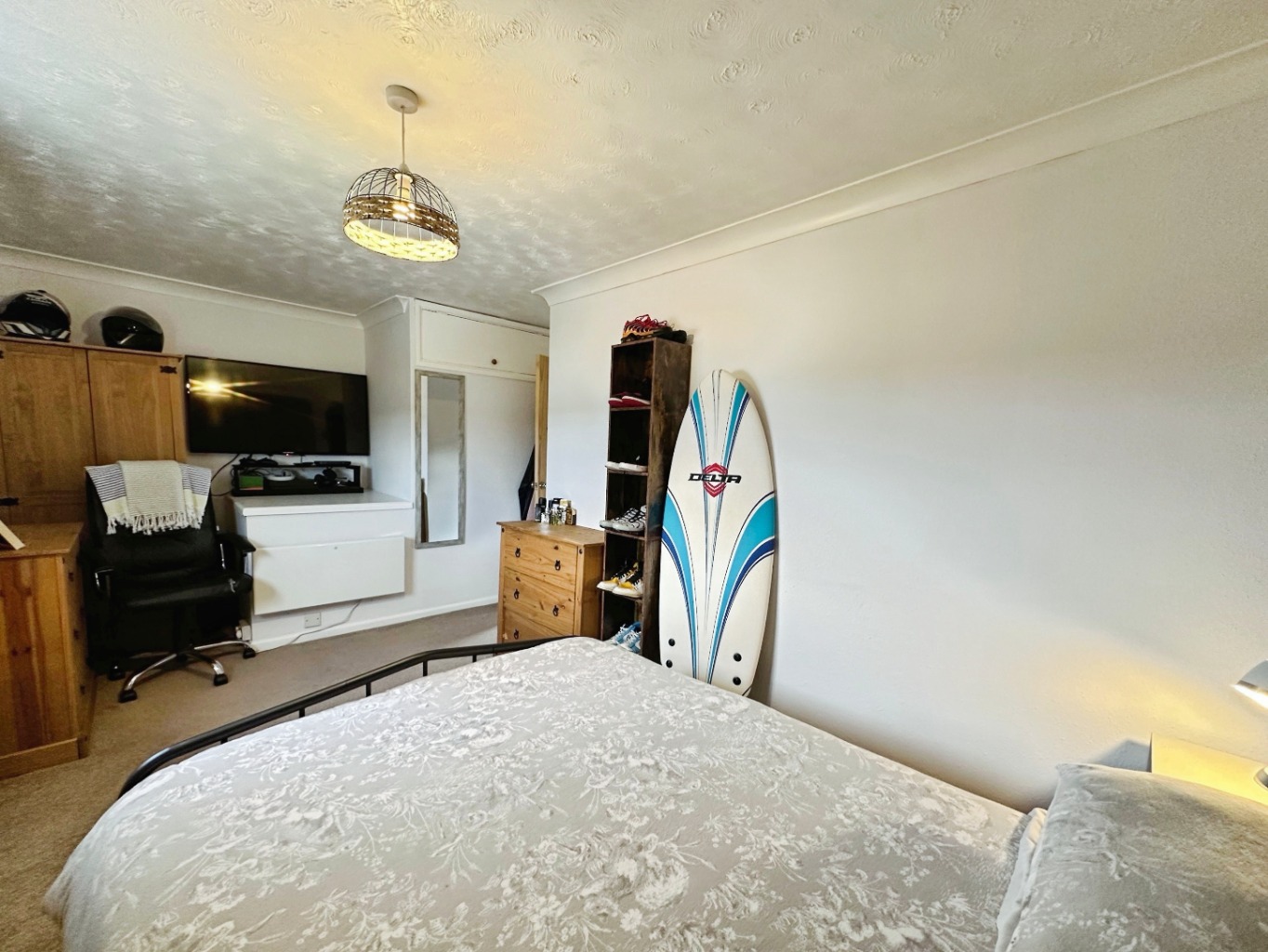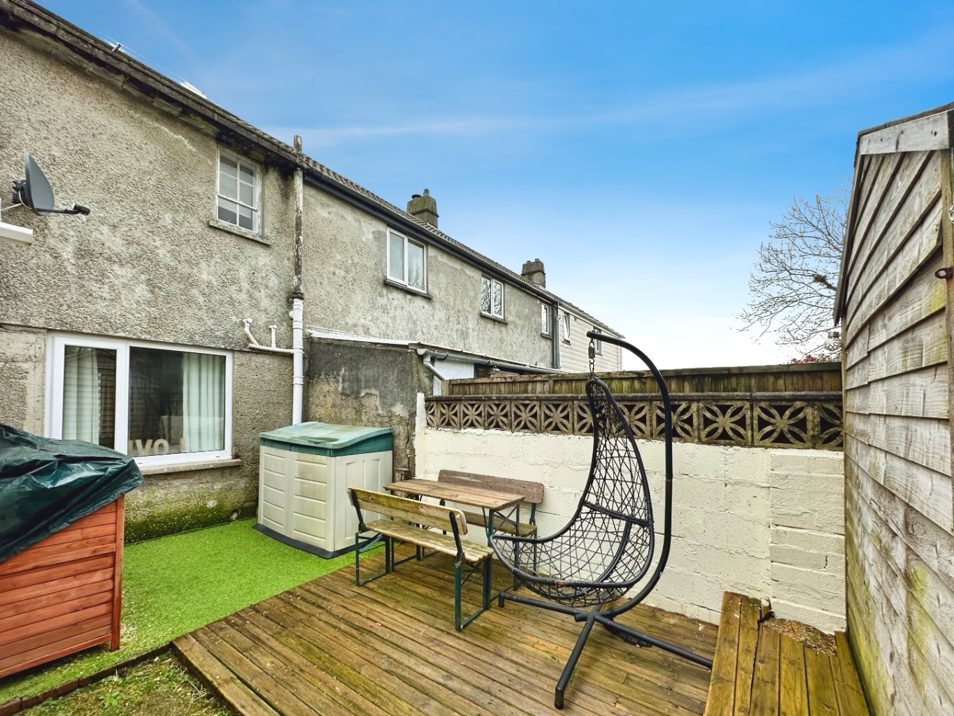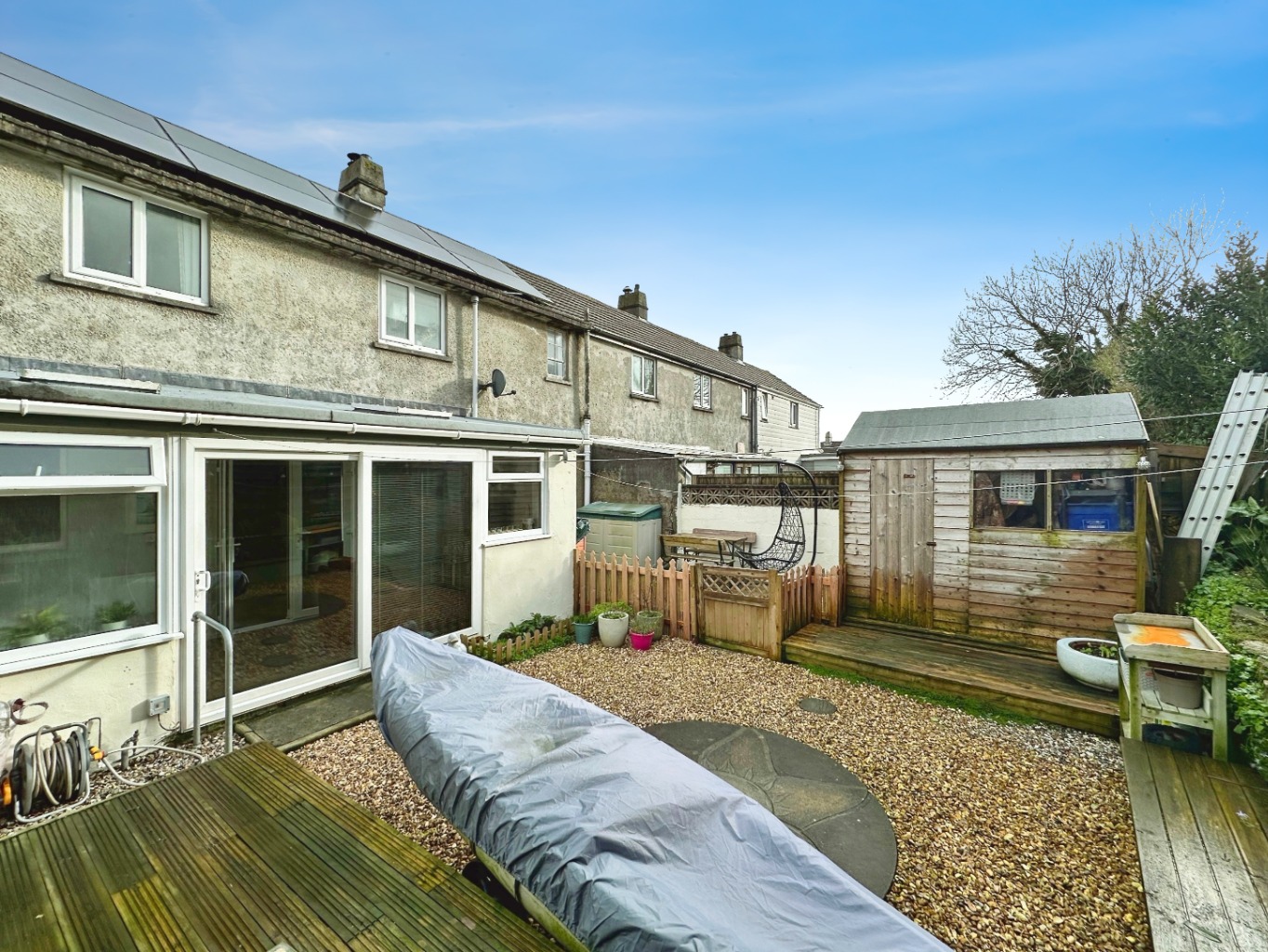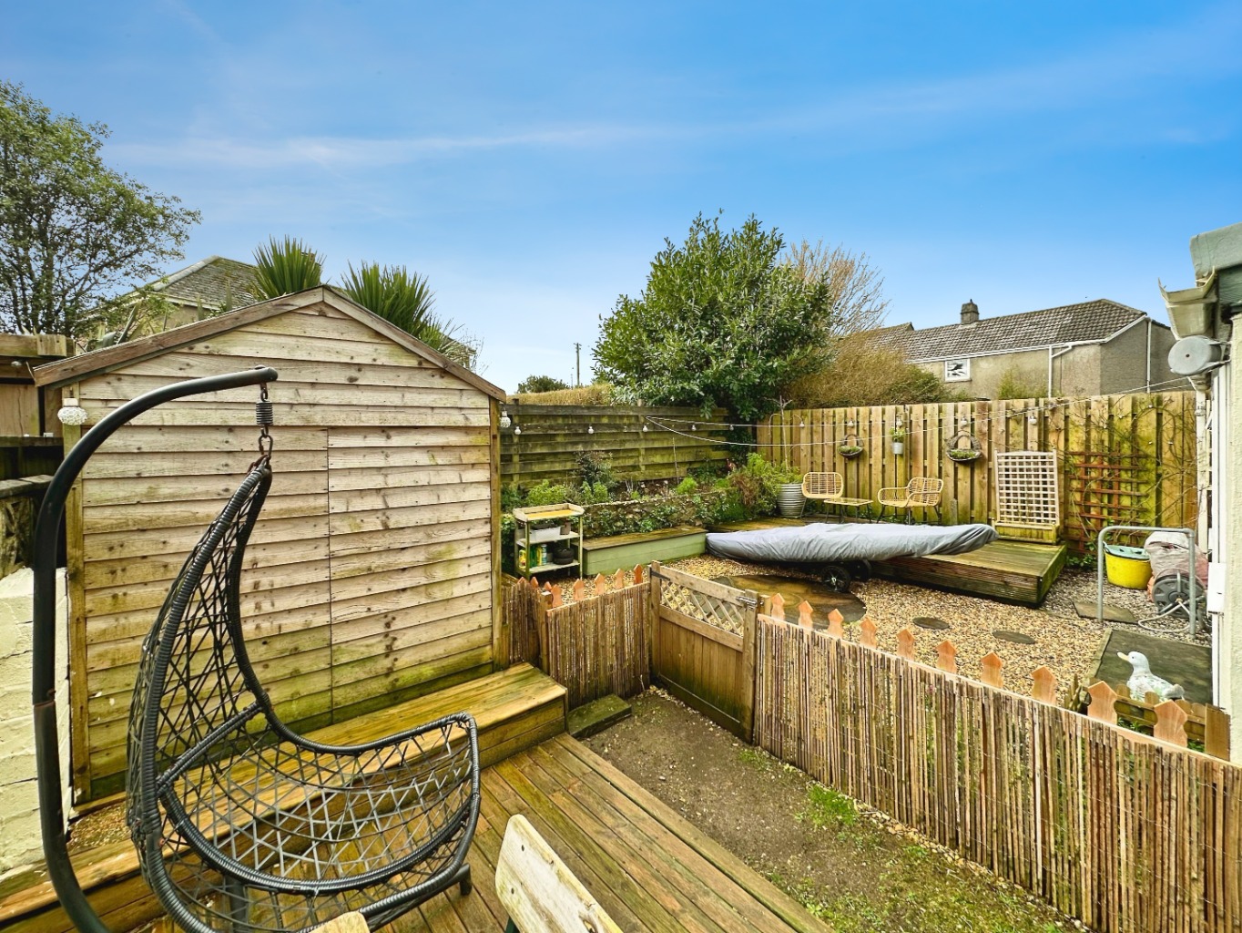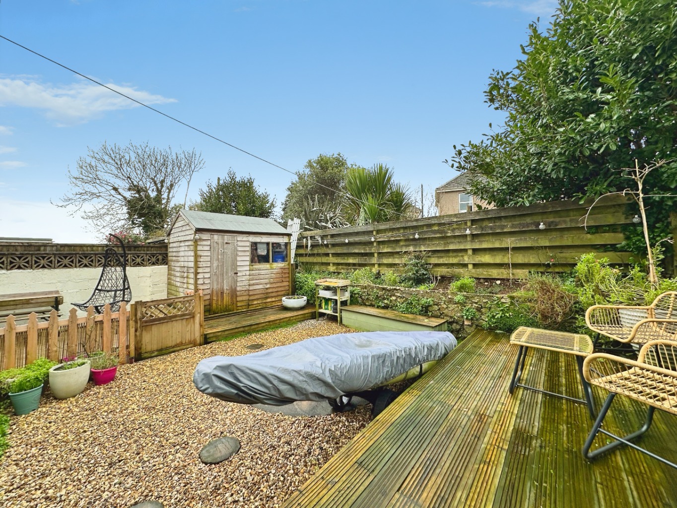 Outside – The enclosed rear garden is fully fenced and predominantly laid to gravel for ease of maintenance. There is a decked seating area directly to the rear of the property, with steps leading down to the main garden. A further raised decked area is positioned toward the rear, alongside planted borders. The garden also benefits from a shed providing useful storage.