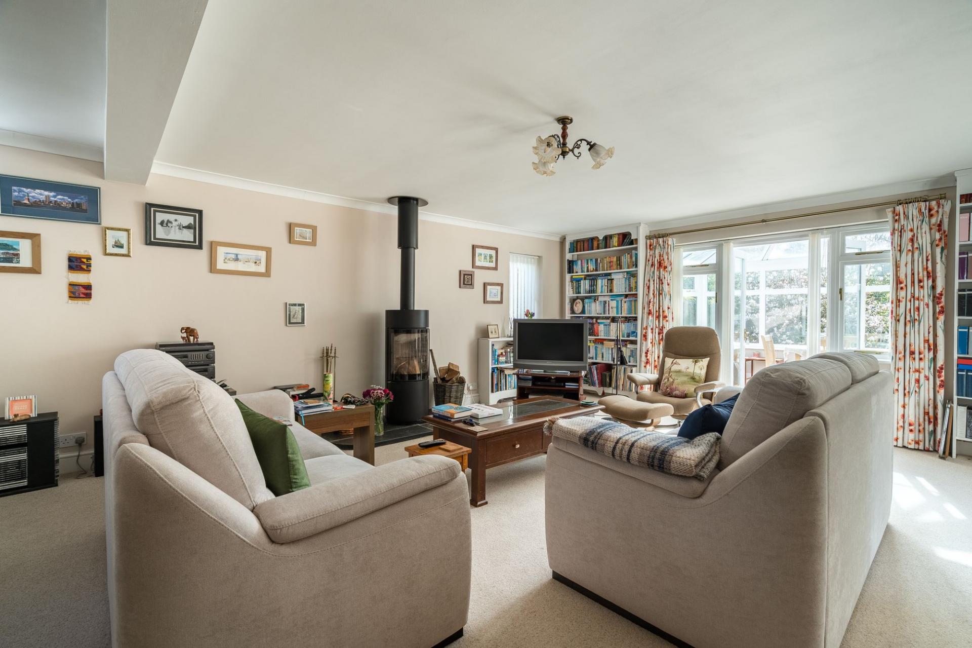 - 29’ long reception room with stylish woodburning stove.