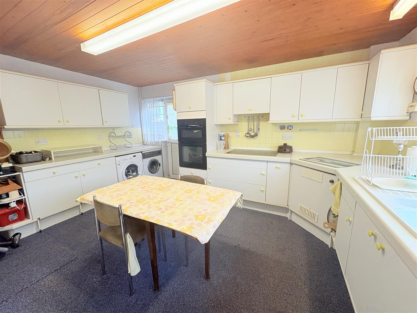 Kitchen/Breakfast Room - 4.627 x 3.728 (15'2" x 12'2") - Pine clad ceiling, window to rear elevation window and door to side, fitted wall and base units with work surface over and inset 1 1/2 bowl sink with mixer tap, built in double oven, hob and cooker hood, plumbing for washing machine and dishwasher, space for fridge/freezer, space for breakfast table and chairs, boiler concealed behind base unit.