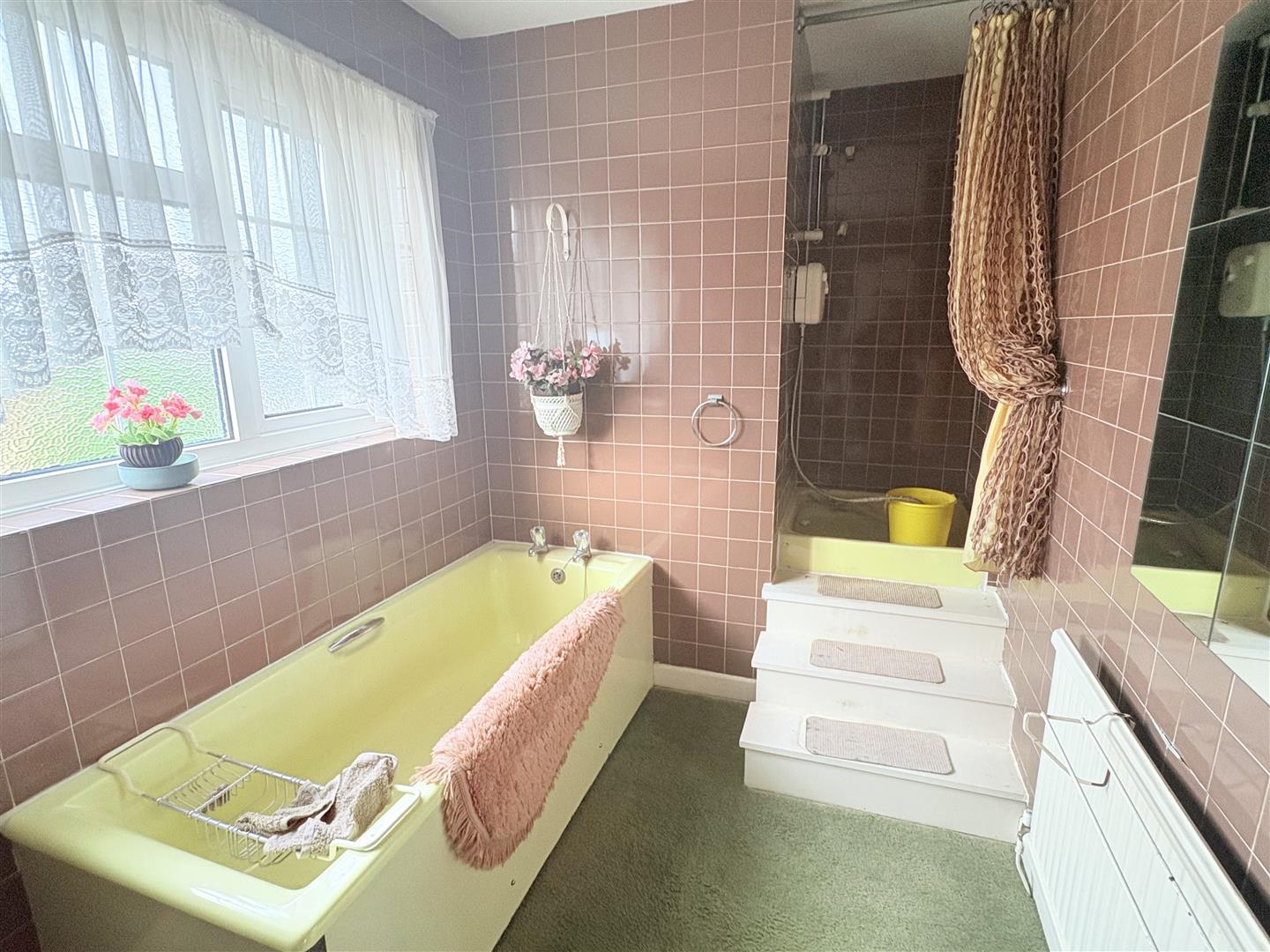 Family Bathroom - 2.898 x 1.912 (9'6" x 6'3") - Textured ceiling, window to front elevation, suite comprising panel bath, pedestal wash basin, W.C, step up to raised shower cubicle, tiled walls, radiator.