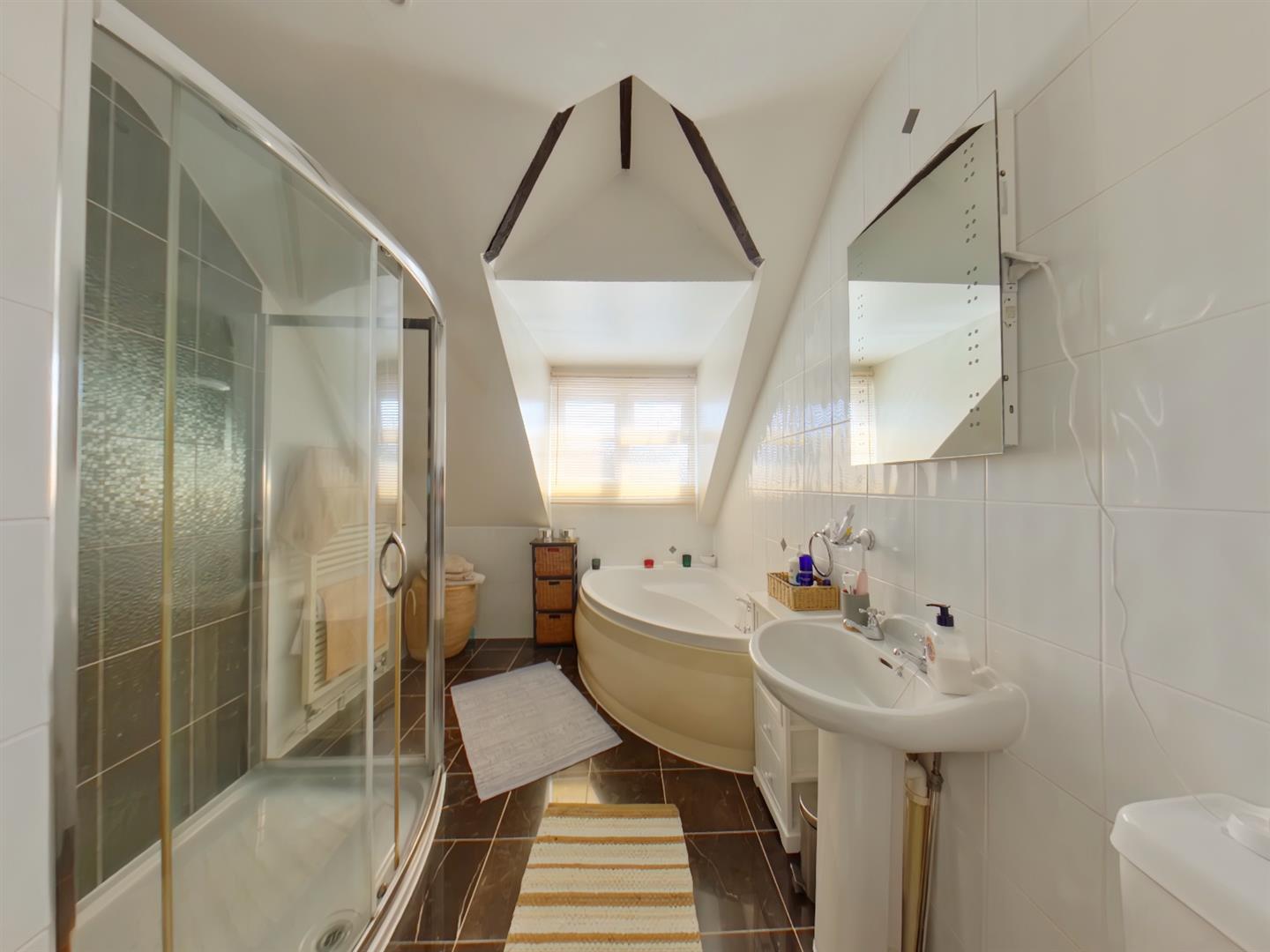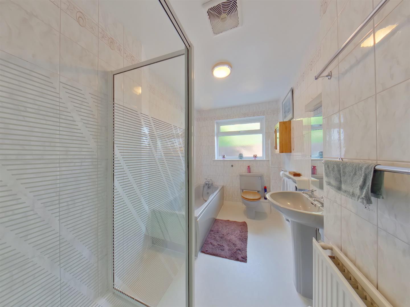 Family Bathroom - 3.53 x 2.30 (11'6" x 7'6") - Fitted with a four piece suite comprising of a corner bath, one and half fully tiled shower cubicle, Low level WC, pedestal wash hand basin, white heated towel rail, fully tiled walls, ceramic tiled floor, double glazed window to front elevation.