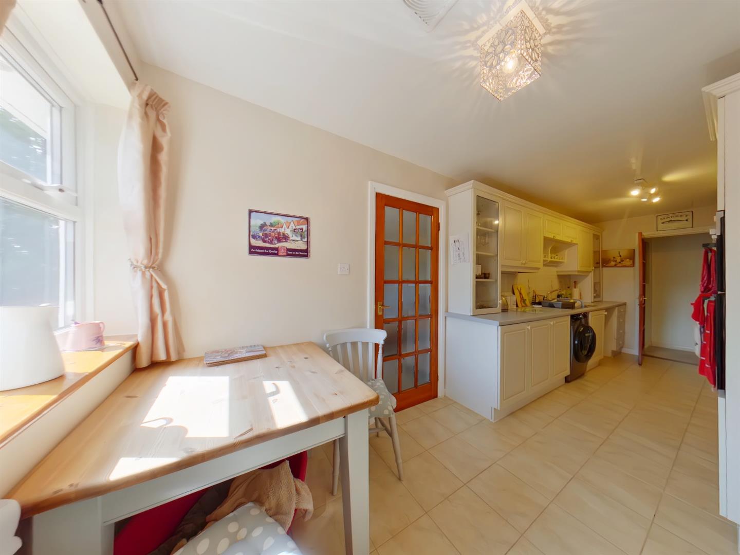 Kitchen/Breakfast Room - 6.24 x 2.24 (20'5" x 7'4") - Fitted with a comprehnesive range of wall and base cupboard/drawer units incorporating glazed display units, built in appliances including an eye level oven, four ring ceramic hob, plumbing for washing machine, space for dishwasher, space for fridge/freezer, area for breakfast table and chairs, ceramic tiled floor, radiator, door to: